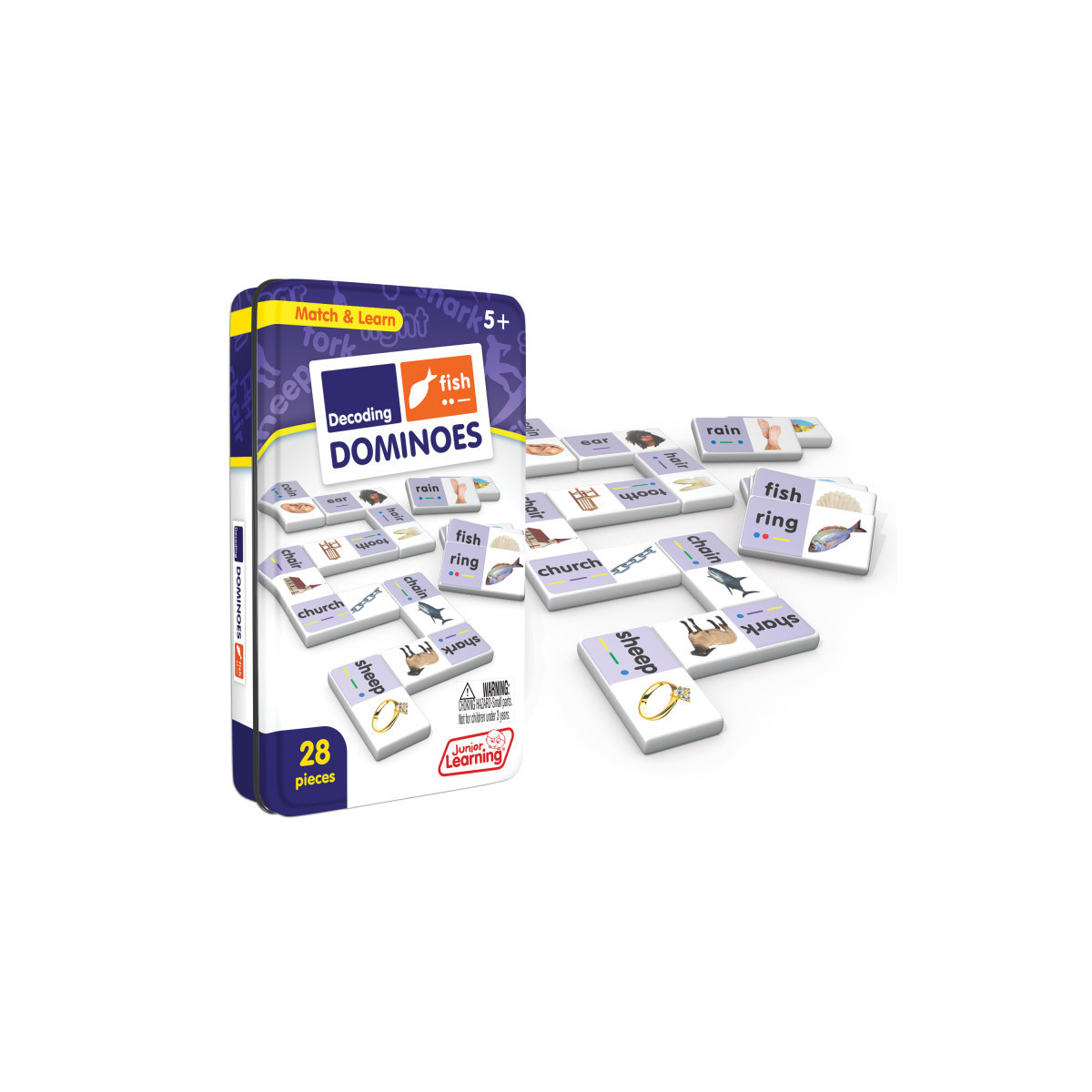 Decoding dominoes include a 28 piece set on thick plastic dominoes. Dominoes come in a collectors tin for storage. Children will love the feel of real dominoes as they complete the decoding matching game.