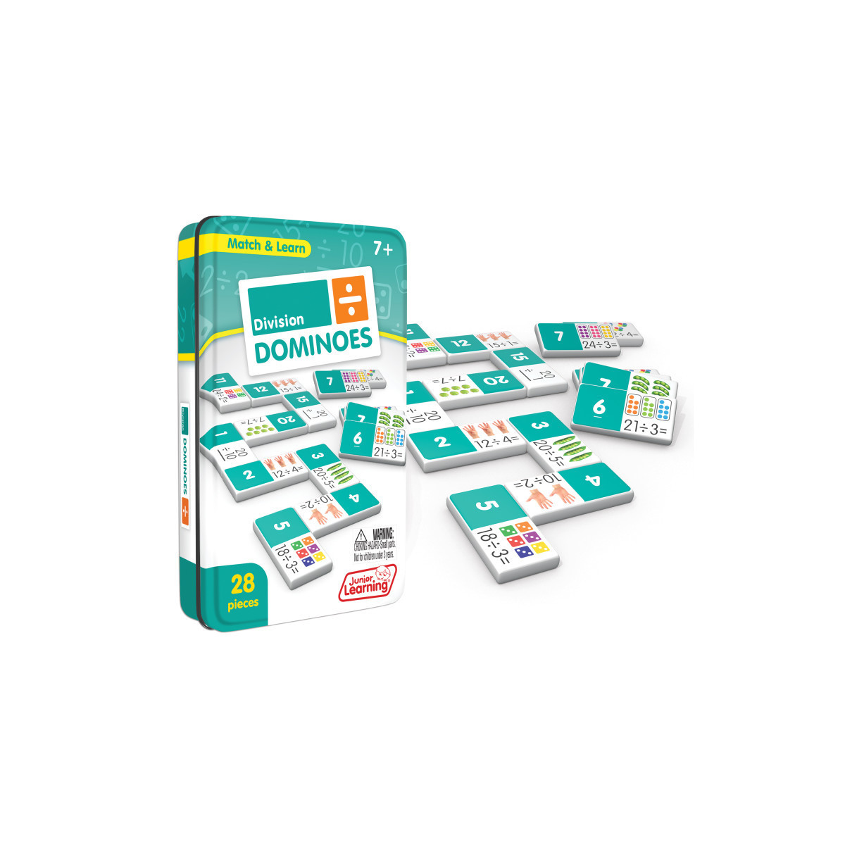 Division dominoes include a 28 piece set on thick plastic dominoes. Dominoes come in a collectors tin for storage. Children will love the feel of real dominoes as they complete the division matching game.