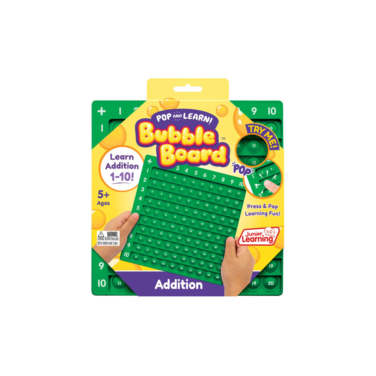 Learn addition facts to twenty with this durable "pop and learn" addition board. Addends one to ten are represented on both the vertical and horizontal axes with the correct sum presented in the corresponding bubble. Pop bubbles as you practice and solve the equation. Bubbles on the reserve side are blank and can be used for creating visual addition examples.