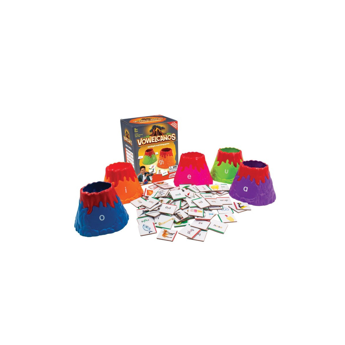 Explore different vowel sounds with Vowelcanos, the self-correcting vowel matching game. Each vowelcano can be used for learning short or long vowels (printed on the front or back). Card tokens are double-sided, with image on one-side for developing phonemic awareness, and word on the other for building decoding skills. Includes 5 double-sided volcanoes, 100 card tokens and an activity guide with the grouped answers. An amazing resource for learning the various vowel patterns that can make the same sound.