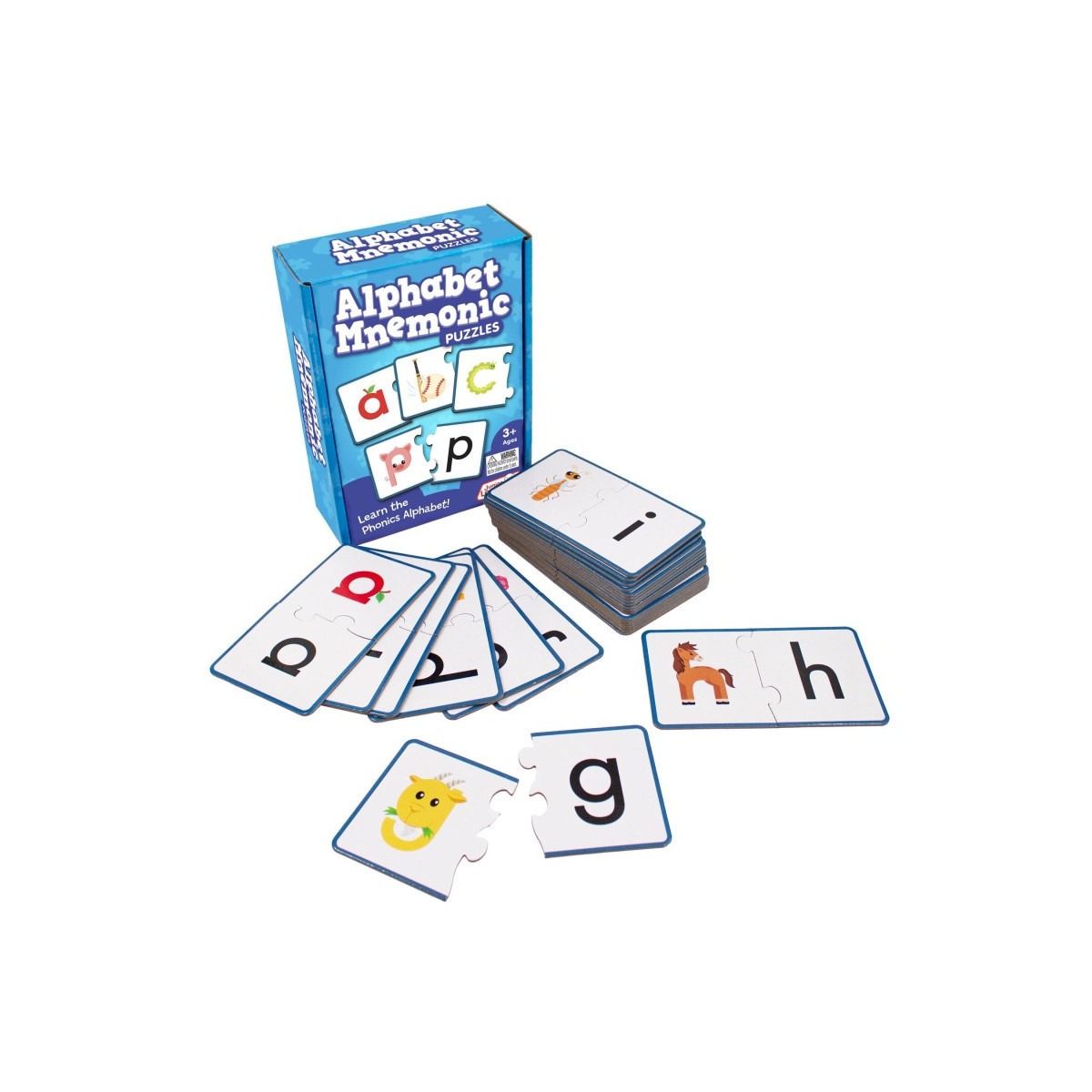 These self-correcting puzzles introduce the 26 letters of the alphabet with mnemonic images. Each mnemonic relates to the sound of the letter and helps children learn both the sound and the letter formation. To play as a puzzle game simply match the mnemonic letter with the letter of the alphabet. Covers all 26 letters.