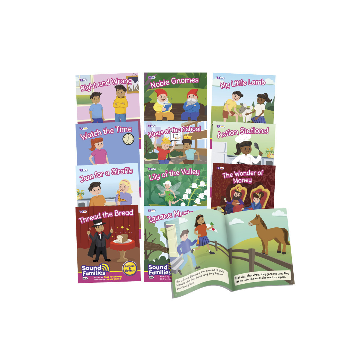 This set of fiction Sound Families decodable readers covers consonants and short vowels (/r/ /n/ /m/ /ch/ /k/ /sh/ /j/ /v/ /u/ /e/ /i/ /s/ /zh/ /z/). There is one title for each sound. Within each reader, alternative spellings are provided (graphemes) for the target sound (phoneme). Children can identify the target sound in the text quickly as they have been highlighted and then compare the spelling across the sound family. Other words included are decodable at the phase level as well as common exception words in accordance to the progression.