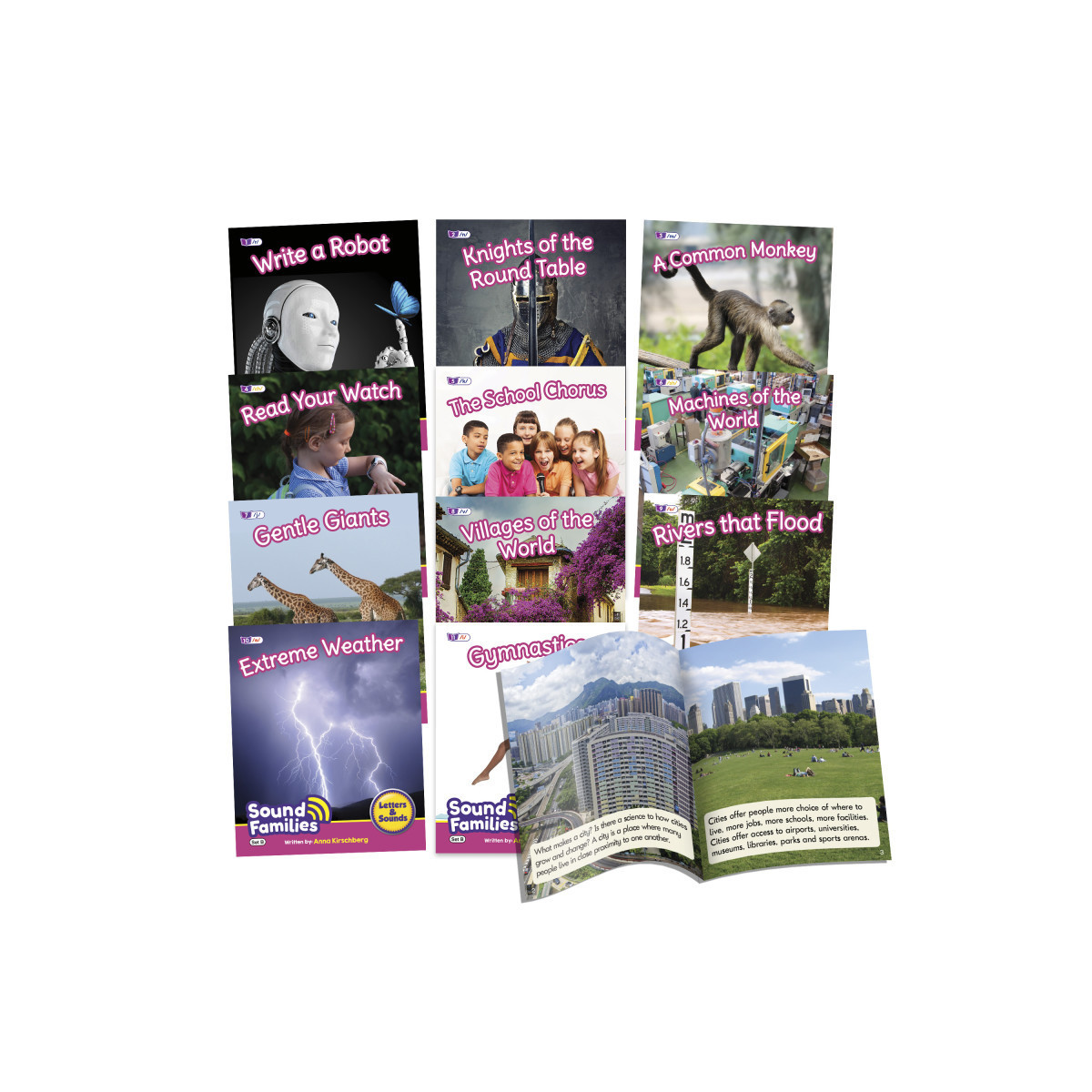 This set of non-fiction Sound Families decodable readers covers consonants and short vowels (/r/ /n/ /m/ /ch/ /k/ /sh/ /j/ /v/ /u/ /e/ /i/ /s/ /zh/ /z/). There is one title for each sound. Within each reader, alternative spellings are provided (graphemes) for the target sound (phoneme). Children can identify the target sound in the text quickly as they have been highlighted and then compare the spelling across the sound family. Other words included are decodable at the phase level as well as common exception words in accordance to the progression.