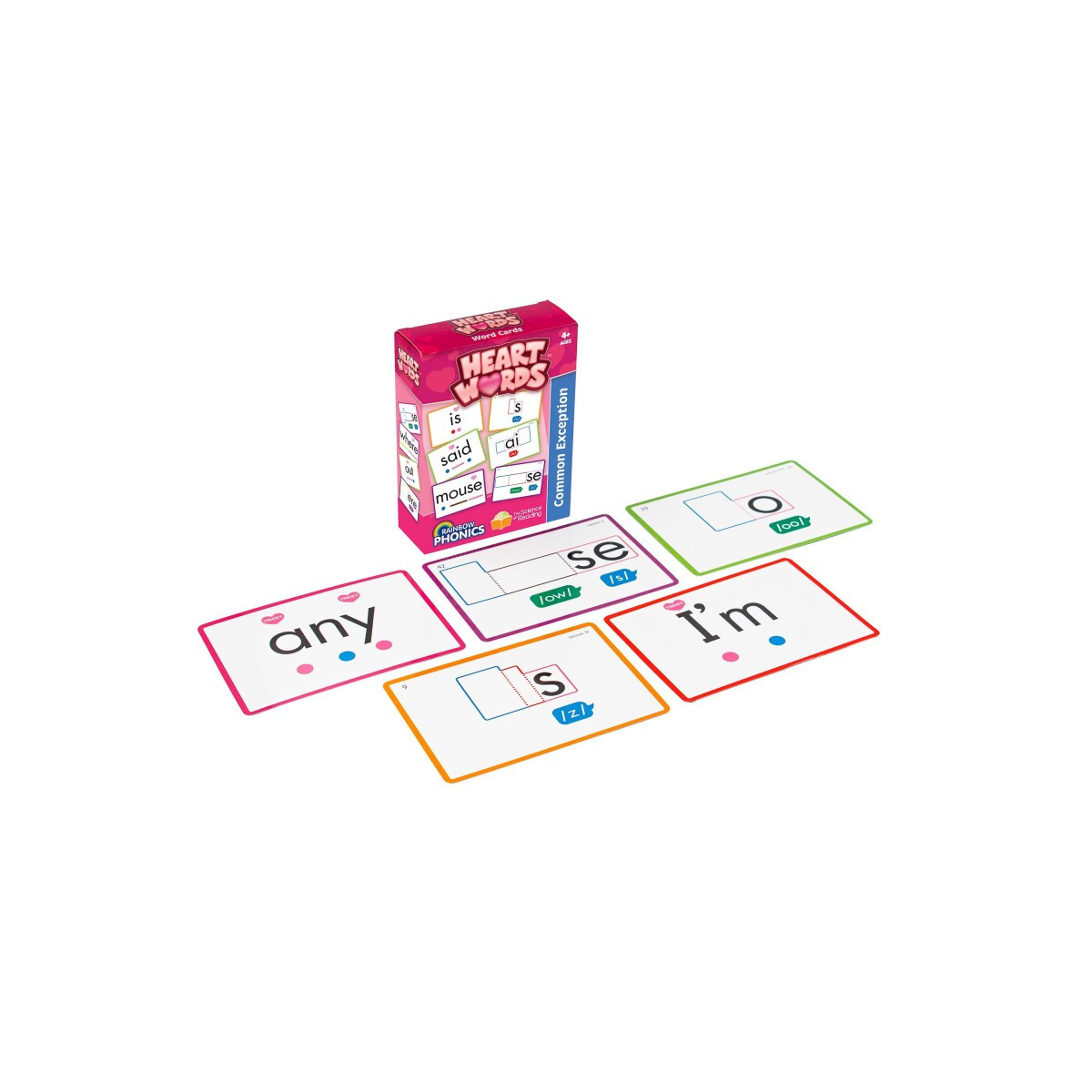 Learn all your Heart Words off by heart. Heart Words by Rainbow Phonics is a set of 93 Heart Word cards which provide visual clues as to how to learn heart words (tricky or common exception words). Each Heart Word card is double-sided. On the front-side is the Heart Word along with sound buttons and a visual clue (love heart) color-coded in pink to show the tricky part of the word. On the reserve is a phoneme frame, with the decodable part of the word missing so the student can use the write and wipe surface to add the decodable letter (or grapheme). The other letters that are tricky are presented along with phoneme speech bubbles. Together these visual clues help children sound the Heart Word out and see the exceptions to the decoding rules.