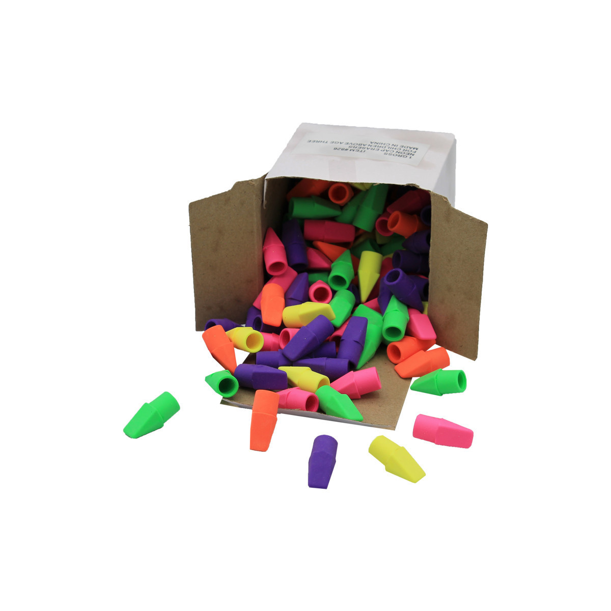 Pencil cap erasers fit most wood pencils, and the angled top makes it easier to erase in tight spots. Assorted neon colors include yellow, green, orange, pink and purple. Moon’s erasers are latex-free. Each pack includes 144 pencil cap erasers.