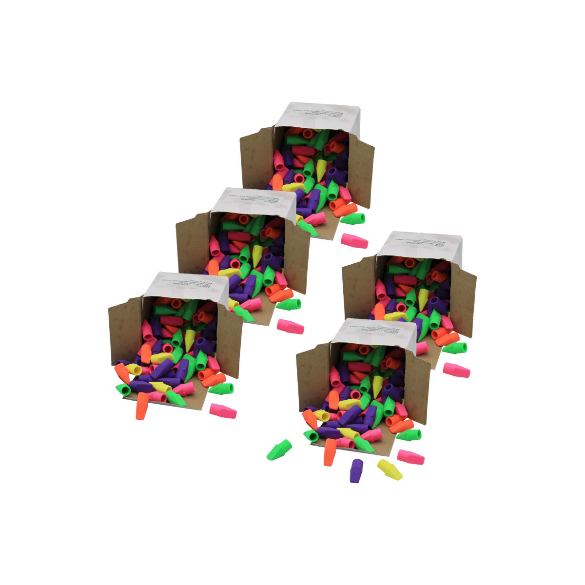 Pencil cap erasers fit most wood pencils, and the angled top makes it easier to erase in tight spots. Assorted neon colors include yellow, green, orange, pink and purple. Each pack includes 144 pencil cap erasers. Sold as 5 packs for a total of 720 pencil cap erasers.