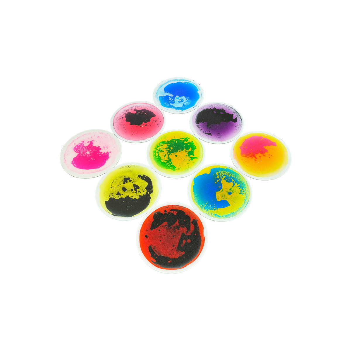 Dive into a world of fun and learning with our sensory Disc Tiles filled with liquid! These tear-resistant and leak-resistant tiles are perfect for games, dancing, and hopping, thanks to their durable design and non-slip backing that keeps them securely in place. Watch in amazement as our vibrant Liquid Floor Tiles change colors with every step, press, or hop, providing a genuine sensory experience that kids will love. Made with non-toxic liquid, these tiles offer endless colorful fun for children of all ages. Engage in a variety of activities with these liquid-filled sensory tiles, from hopscotch to dancing to rolling over them. The captivating motion of the "lava" inside the tiles adds an extra element of fun and creativity to playtime. Perfect for both home and classroom settings, our hassle-free floor activity mat tiles are ideal for teaching colors, guiding kids to specific spots, or simply having fun with friends. The vibrant colors and slip-resistant design make them a safe and visually stimulating option for children of all ages. Set of 9 disc-shaped liquid floor tiles measuring 12".