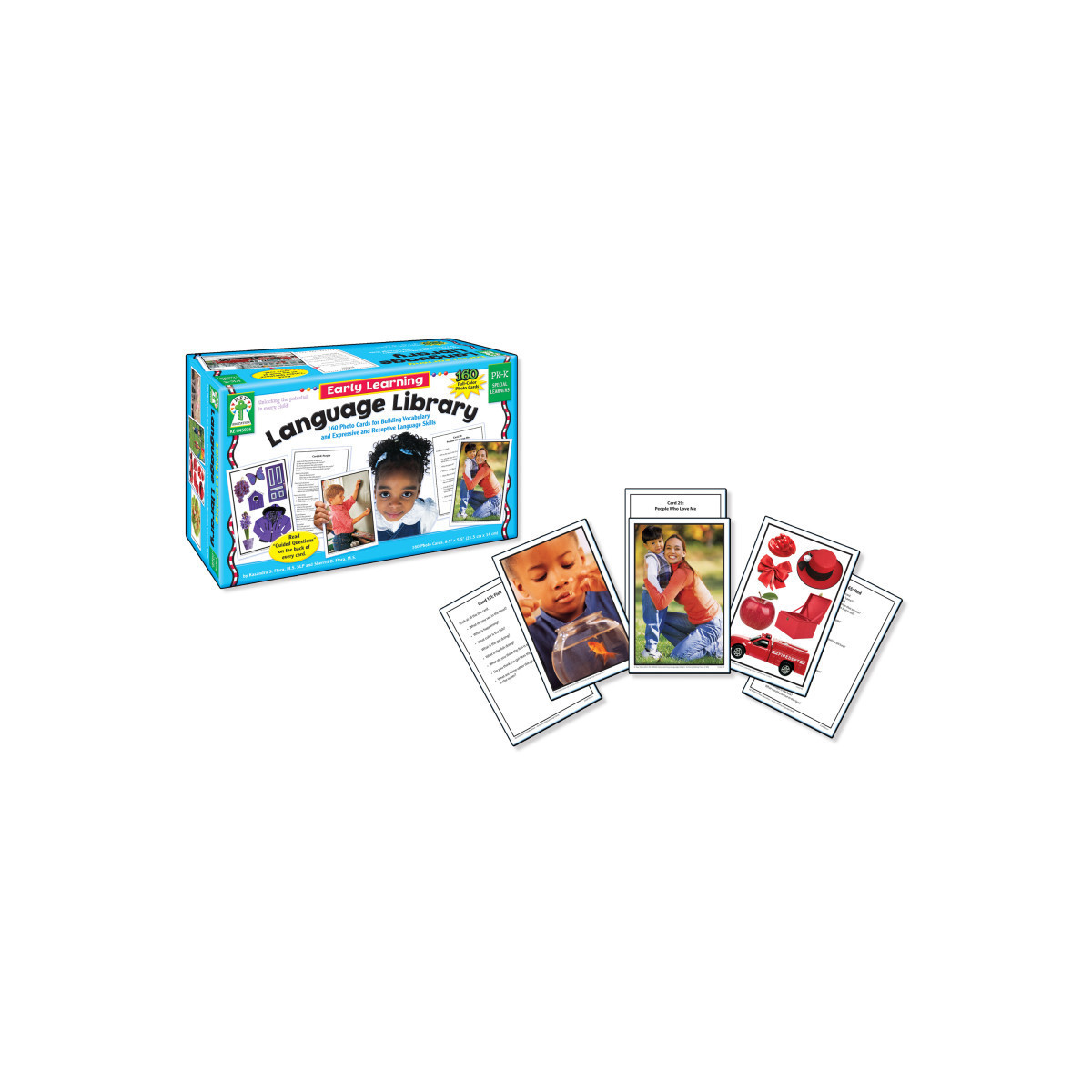 The Early Learning Language Library includes 160 photographic cards that will help build vocabulary and expressive language skills. This invaluable teaching tool not only reinforces basic principles for young learners, but also improves communication skills. Includes photographs of everyday objects with guided questions on the back of every card, as well as a resource guide with word lists and activity ideas in English and Spanish. Key Education products are intended to engage and educate young and special learners, as well as assist teachers in building a strong and developmentally appropriate curriculum for these children.