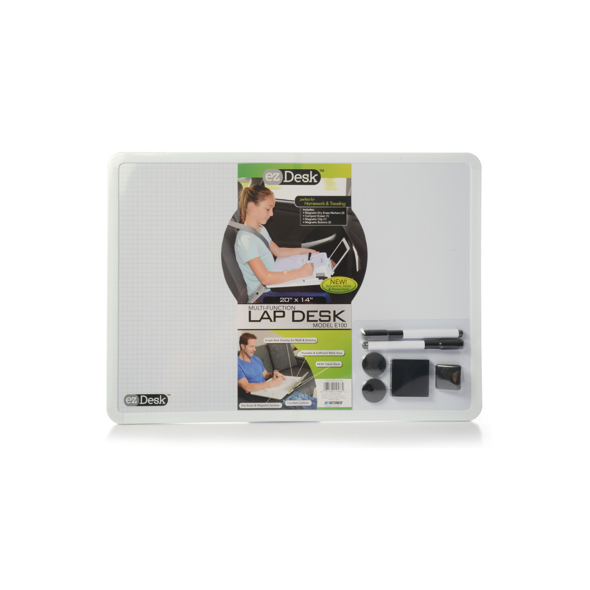 Turn any couch, dining room table or park bench into an office or classroom with the EzDesk Lap Desk. Just choose a comfy place and start working. The EzDesk features an adjustable dock easel, which allows you to prop your tablet or phone on your lap desk for hands-free viewing and note taking. Or just kick back and binge watch your favorite shows. The 20" x 14" EzDesk will fit laptops up to 17" but it's slim, lightweight design will store with ease. The EzDesk features a magnetic dry erase surface that has a graph rule overlay on one half and a blank dry erase board on the other. Great for students working on their math homework or business professionals taking notes. The comfort cushion on the bottom provides the perfect angle for working or viewing.