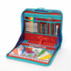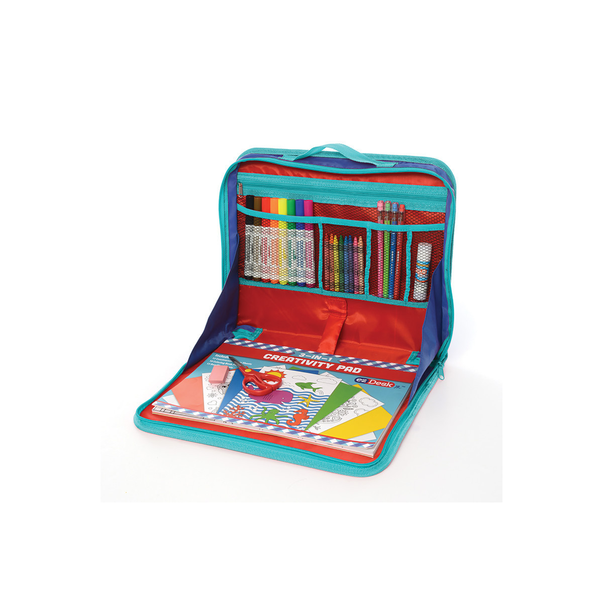 The EzDesk allows your kids to work on art projects or homework anywhere. Use the easy-carry handle to take it to the park or stay at home on the couch. The 11.4" x 13.8" EzDesk allows your kids to feel like they're working just like mom and dad. Store their tablets, Kindle or art projects safe in the inside zippered pocket. Kids can find their supplies quickly with the four open, mesh pockets, conveniently stocked with 8 non-toxic washable markers, 4 pop-up style pencils, a non-toxic glue stick, a pink eraser and a pair of scissors. Designed with road trips in mind, the sturdy polyester canvas EzDesk Travel Activity Kit will stay open while your little artist creates on the 40 sheet creative pad with coloring, doodle and construction paper sheet that are included, on any flat surface.