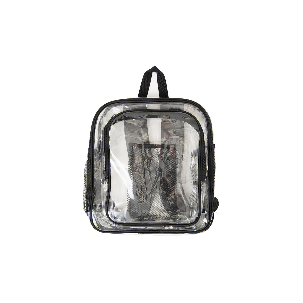 14" Premium Clear Vinyl Backpack is made of thicker PVC material. Spacious and stylish to keep you organized and looking good. See through bag helps you get through security checkpoints much easier. Features reinforced straps, front zip pocket, interior mesh pocket and exterior side mesh pockets. Backpack measures 14" x 13" x 7" with 0.4mm thickness.