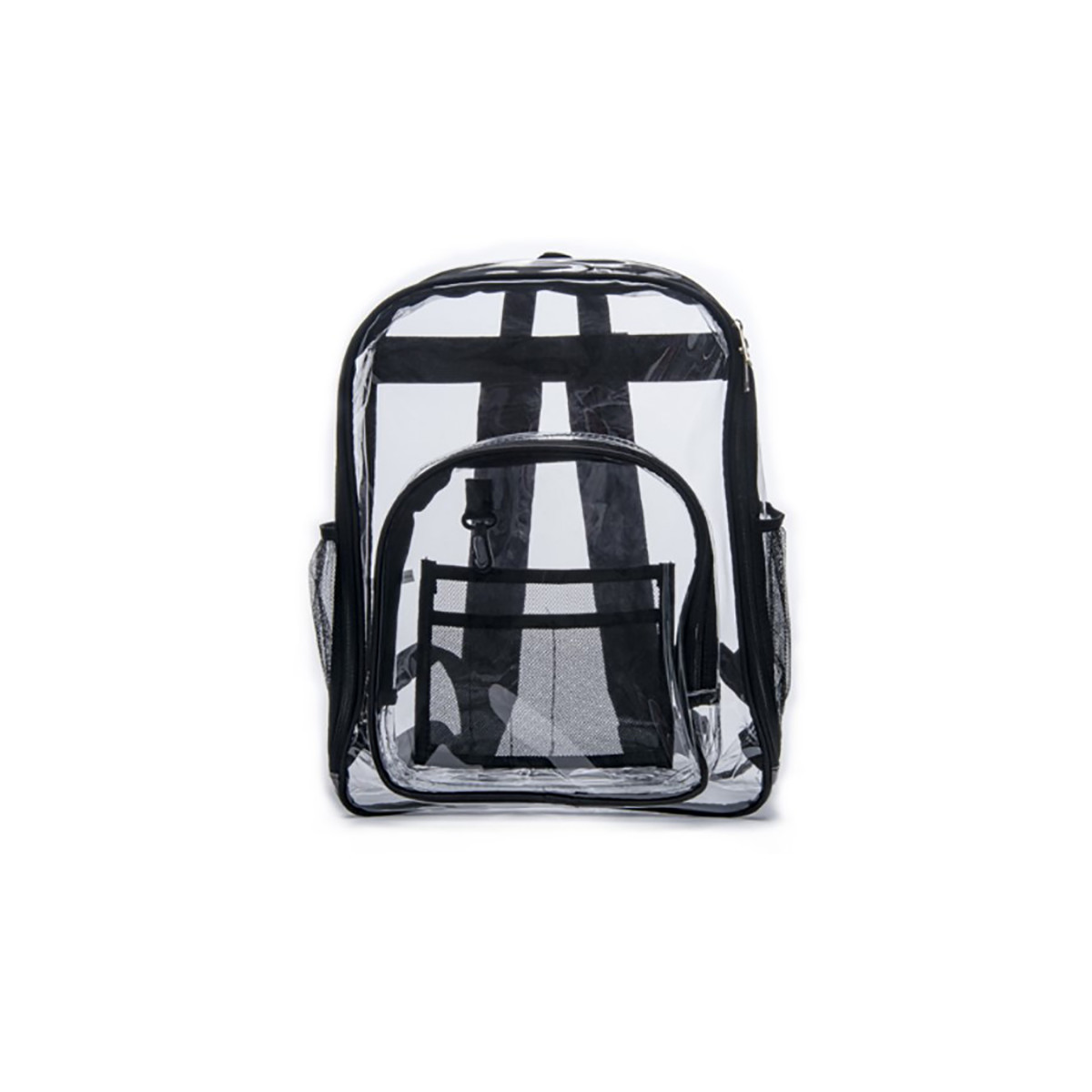16.5" Premium Clear Vinyl Backpack perfect for stadium events, school, etc. See through backpack will keep all your valuable belongings and accessories secure. Made of thicker PVC material. Spacious and stylish t keep you organized and looking good. See through bag helps you get through security checkpoints much easier. Reinforced Straps, Front Zip Pocket Interior Mesh Pocket and Exterior Side Mesh Pockets. Measures 16.5" x 13" x 6.7", 0.4mm Thickness.