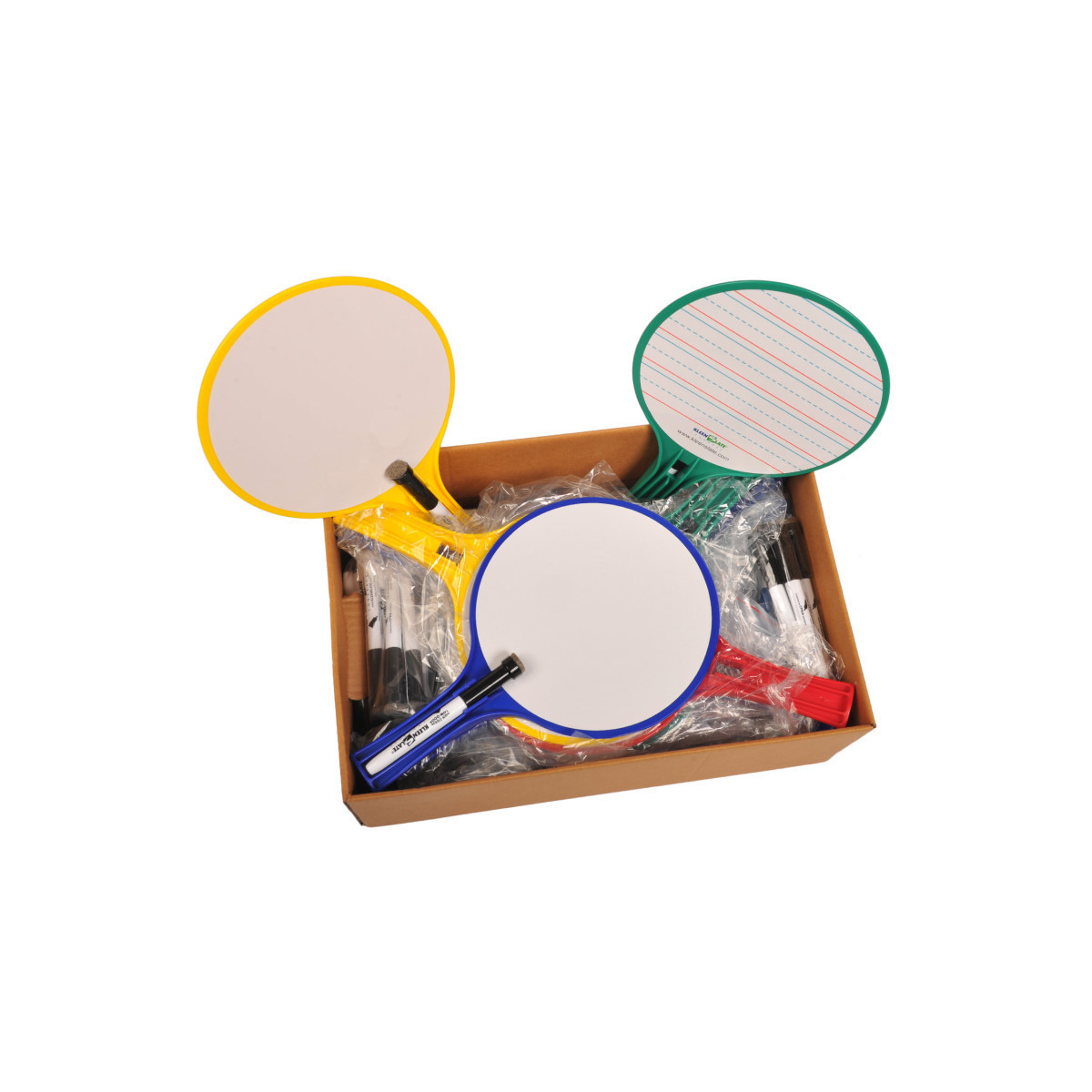 Made of durable, long-lasting plastic. Great for games, review, and testing in all subjects and for all grades. Each dry-erase paddle has one blank side and one ruled side. Paddles feature 7" x 7" writing surface. Includes black dry erase markers with 48 hour CAP-OFF Ink and eraser that stores conveniently in the handle. Markers conform to CPSIA and ASTM D-4326 standards and fit in the handles of the dry erase whiteboards and are certified non-toxic and low odor. Includes 12 paddles, 12 small black dry erase markers and erasers, 4-pack of large dry erase markers for the teacher and a microfiber cleaning cloth.