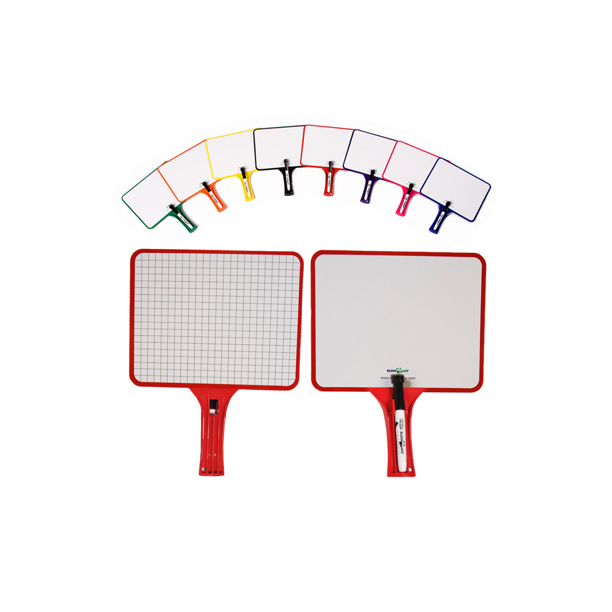 Teachers and trainers find these award-winning 2 sided dry erase paddles, engaging, easy to clean and store, and great for active learning. Lightweight and perfect in size for both young students and adults with a 9.5" x 7.5" writing surface. Paddles are blank on one side and have a graph on the other side. Packaged with markers and eraser for "out of the box" convenience. Set includes 32 whiteboards in 8 assorted colors, 32 dry erase black markers with 48 hour CAP-OFF Ink and eraser, and (1) 14" x 7" microfiber cloth with bookbinder ring. Markers conform to CPSIA and ASTM D-4326 standards and fit in the handles of the dry erase whiteboards and are certified non-toxic and low odor.