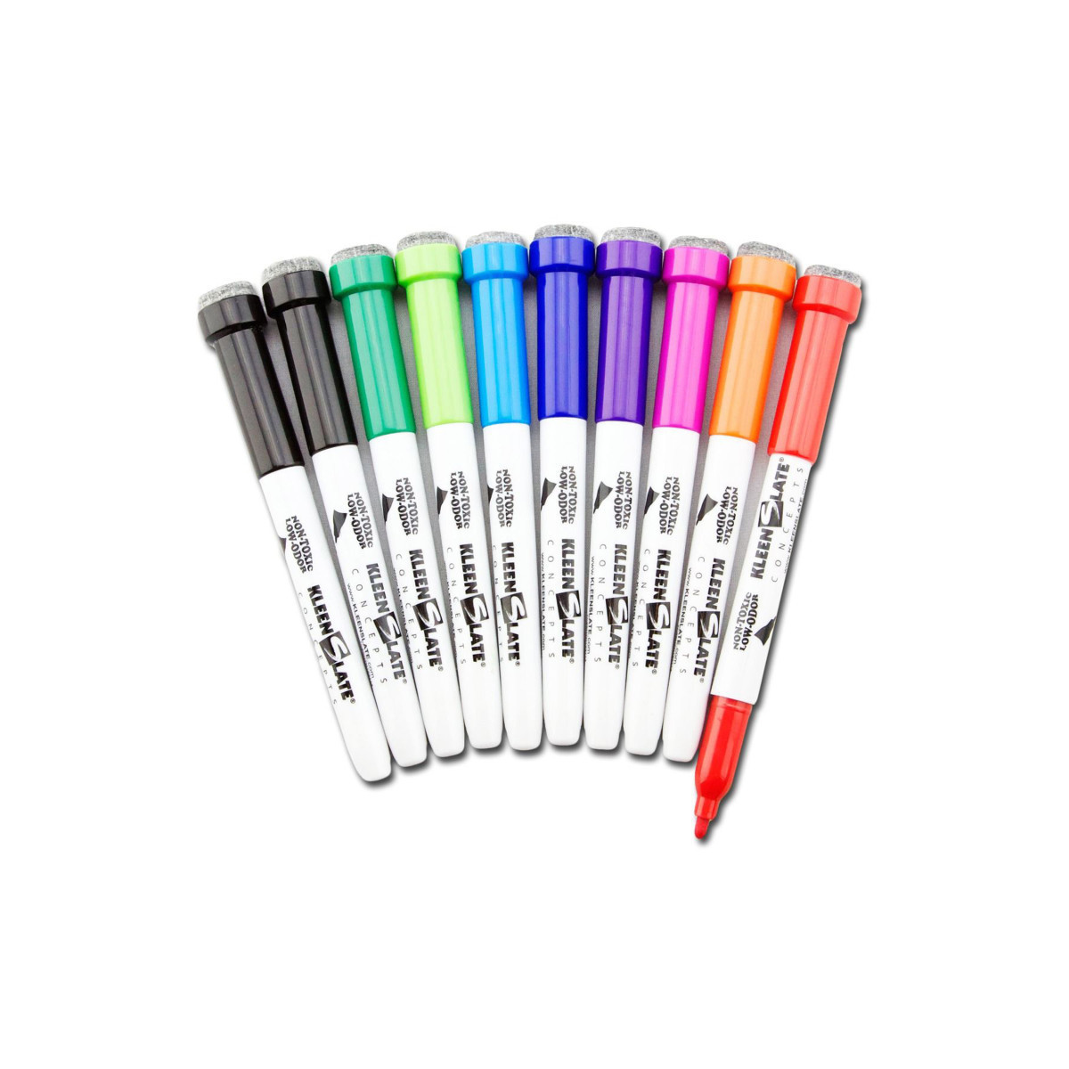 Small dry erase black markers with eraser and round tip. Points of markers don't push in. Markers are filled with 48 hour CAP-OFF Ink. Conforms to CPSIA and ASTM D-4326 standards. Certified non-toxic and low odor. Fits in handle of KleenSlate whiteboards. 10 markers in assorted colors per pack.