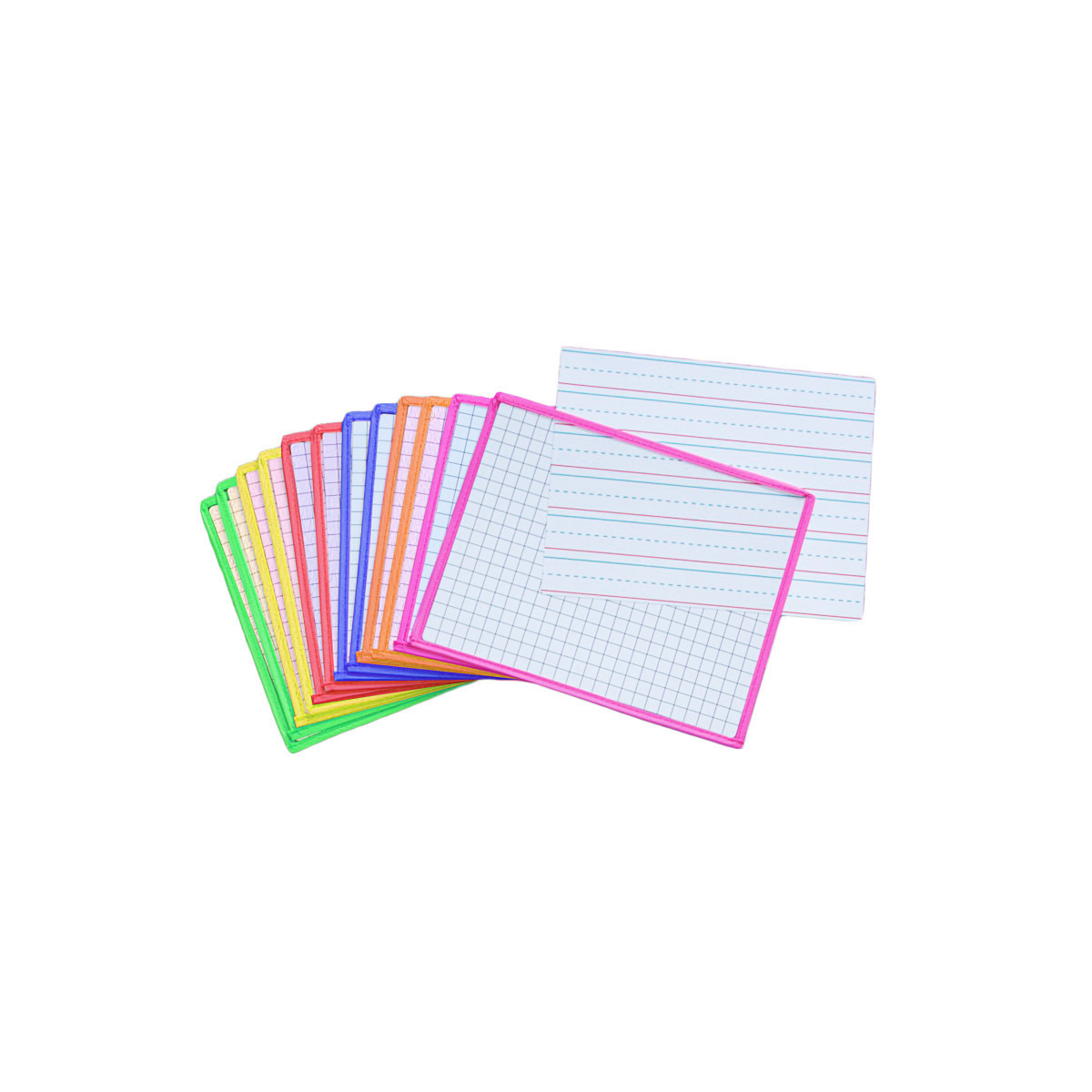 Customizable, adhesive clear dry erase Sleeves for KleenSlate whiteboards. Use these sleeves to tailor white boards to specific lessons in the classroom. Sleeves come in 6 assorted colors. Sleeves accommodate 9.5" x 7.5" writing surfaces. Includes a 2-sided graph/lined template and a 12" x 12" microfiber cleaning cloth. Sold as a pack of 12 sleeves.