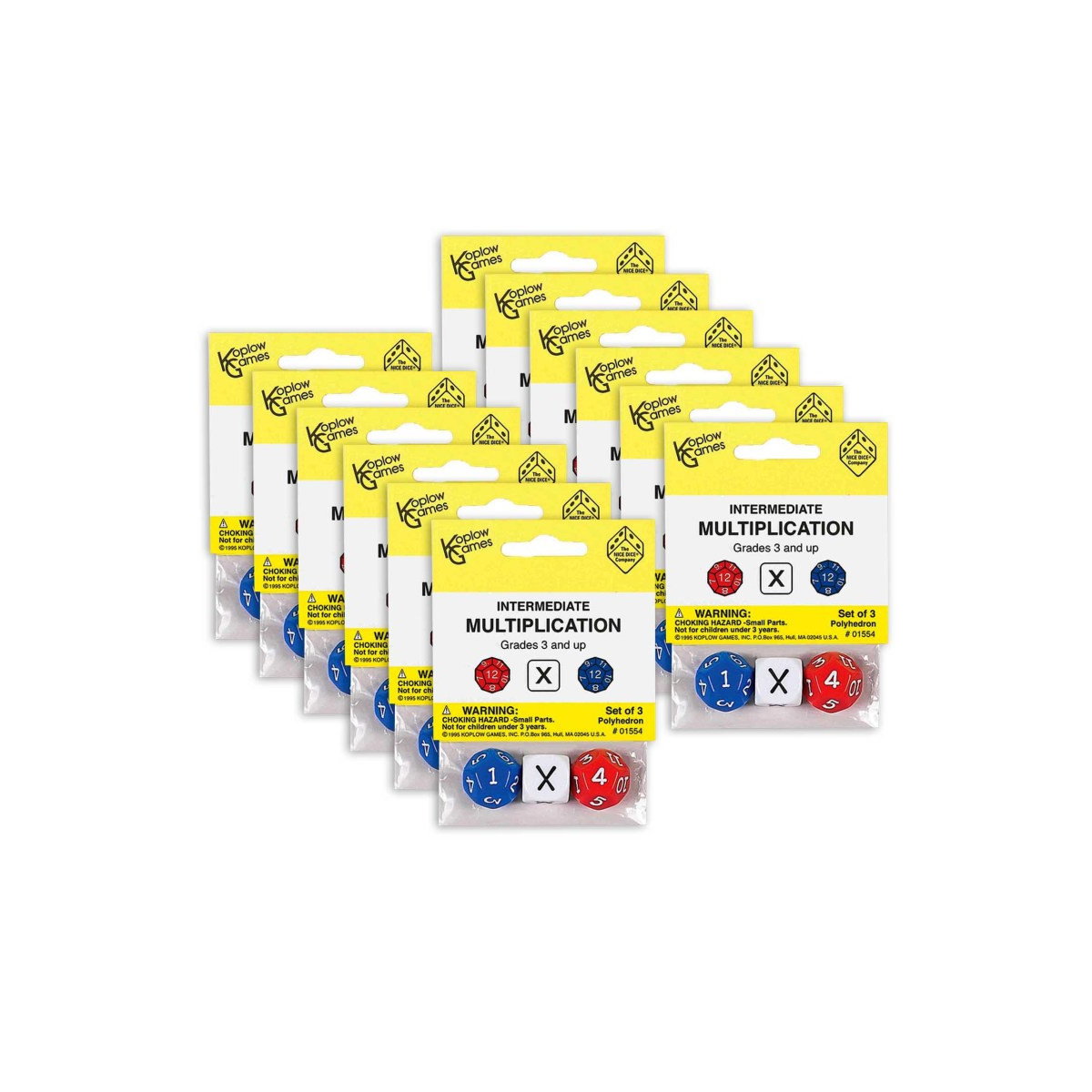 Fast, easy and hands on. An instant random multiplication problem generator. Practice your multiplication tables from 1 x 1 to 12 x 12 with just a roll of the dice. Each set includes 3 dice, (2) 12-sided dice and 1 multiplication dice. Sold as 12 sets for a total of 36 dice.