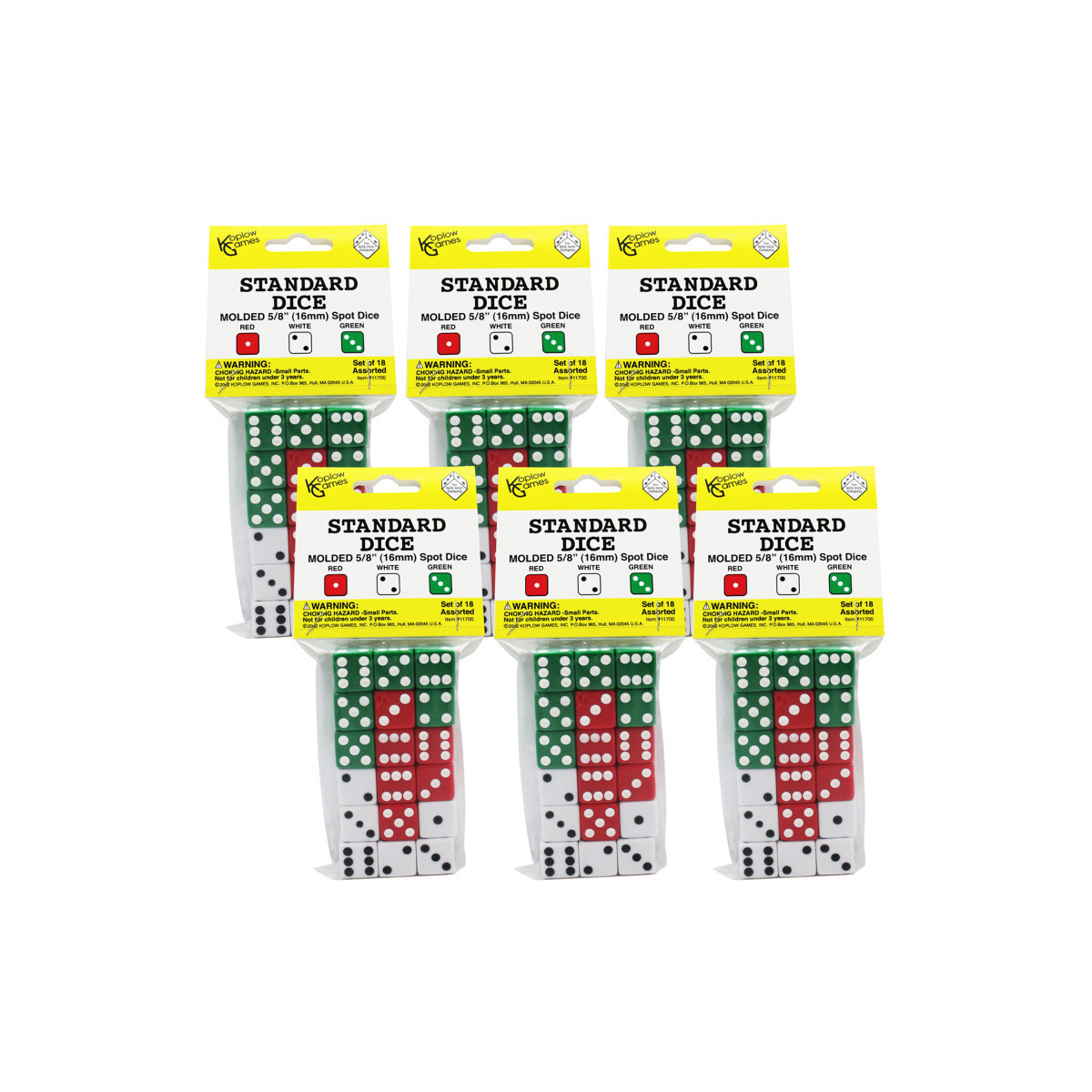 Everyday classroom dice with hundreds of counting, sorting and math applications. A hands on way to practice basic math skills. Each pack includes 6 each of red, white, and green 5/8" (16mm) molded dot dice for a total of 18 dice. Sold as 6 packs, 108 dice total.