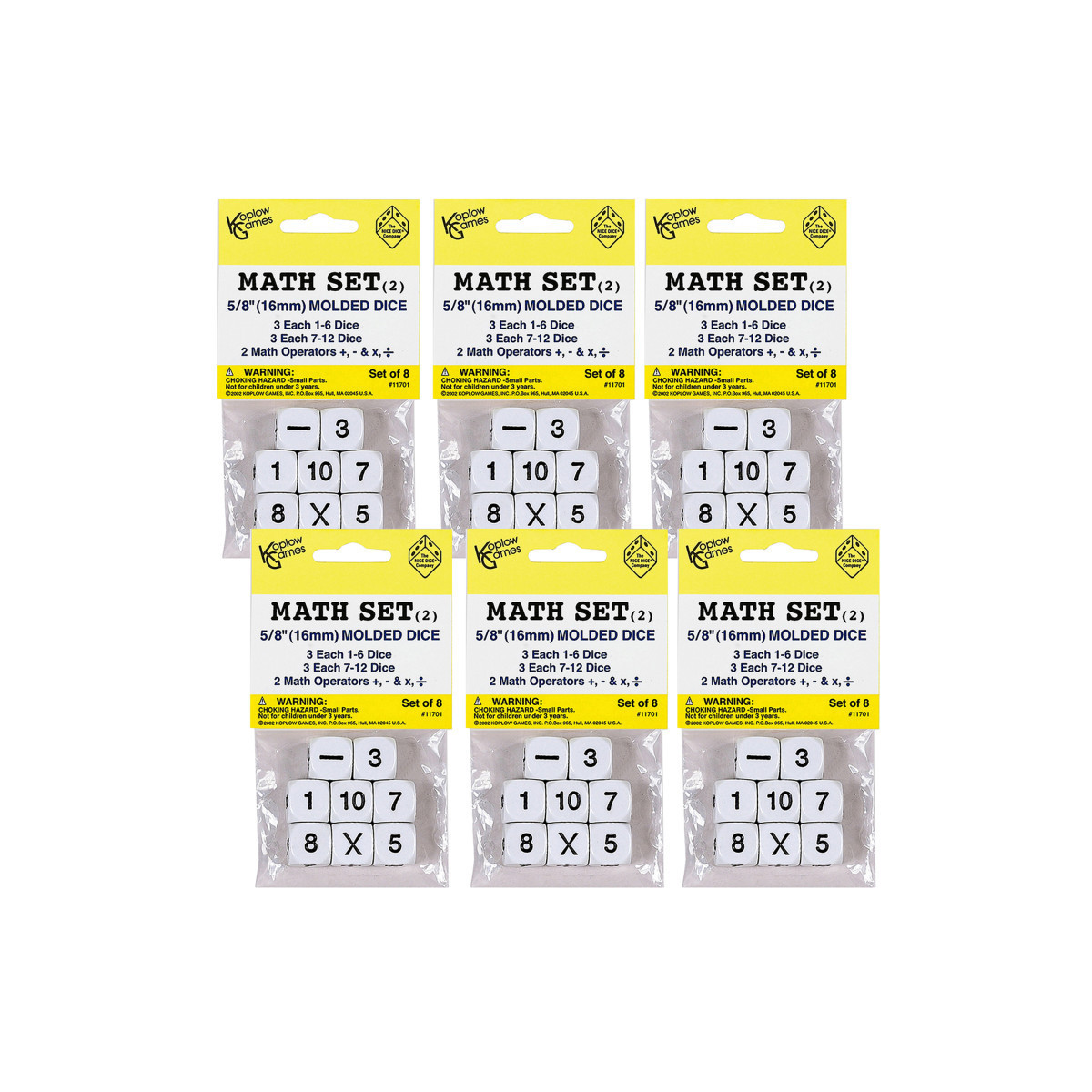 Koplow Games Math Dice Set is a fun, hands-on way for students to learn basic math skills. Children learn more effectively when it is reinforced through play. Perfect for individual play, in small groups or as a classroom making these dice a great educational resource. Dice measure 16mm (5/8"). Each set includes 8 dice: 3 each of 1-6 dice, 3 each of 7-12 dice and 2 math operator dice. Sold as 6 sets, 48 dice total.