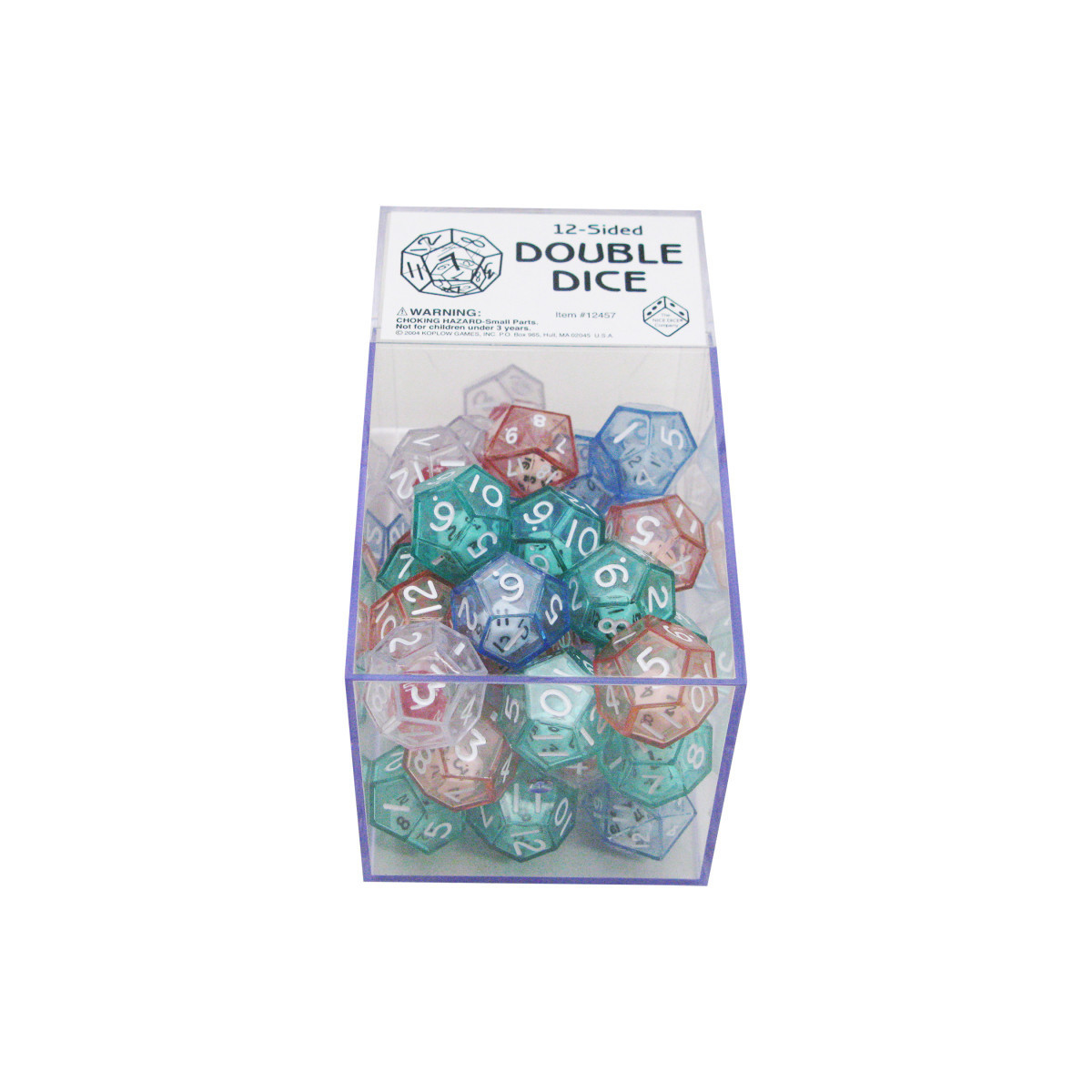 The 12-sided double dice are unique die within a die. The interior die is a mini-d12 and the outer die is also a d12. This two dice combination of dodecahedrons allows for interesting options on every roll. Each time the die is rolled the player will get two results, one from the inside die and one from the outside die. These two results can be added together, multiplied by each other and possibly even divided by each other. Each box includes 40 dice.