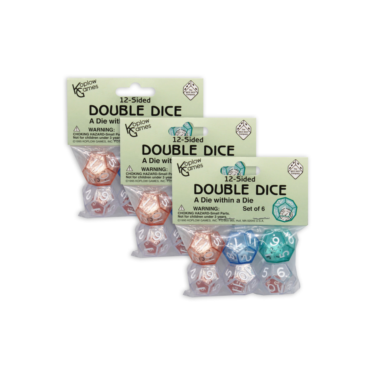 Koplow Games 12-sided double dice, a die inside of a die, is great for math games! Roll it and add, subtract, multiply or divide the numbers. A great way to practice and understand basic math skills and enhance games and activities. Each pack includes 6 dice in assorted colors. Sold as 3 packs for a total of 18 dice.
