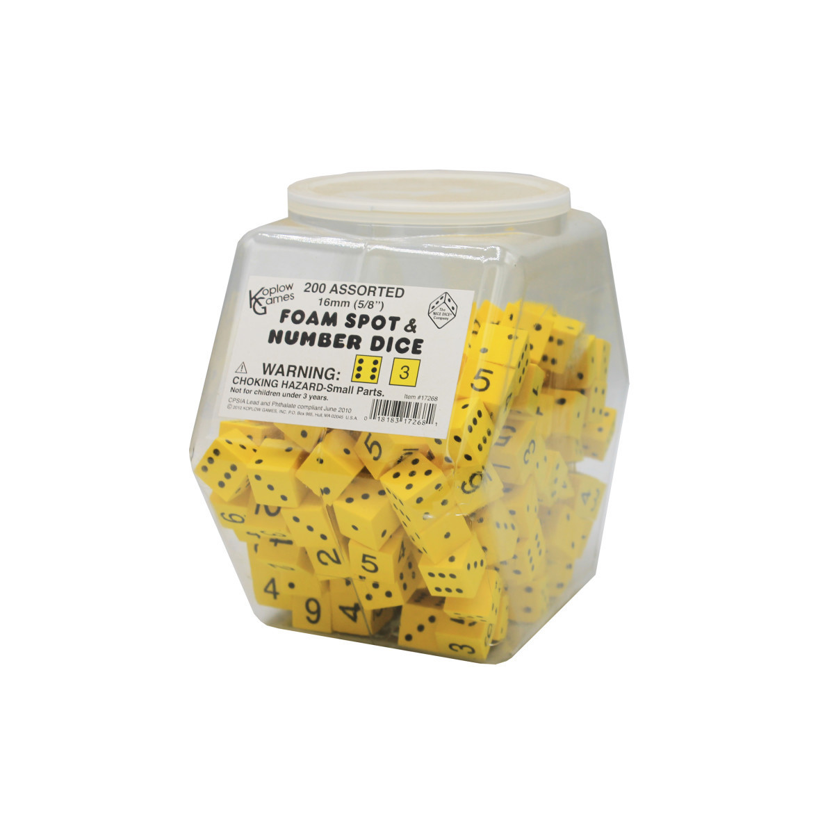 The perfect classroom item to help students with mathematical concepts. Spot Foam Dice are super quiet and fun. Includes sturdy plastic container for convenient storage. Each set includes 200 16mm (5/8") yellow foam dice. Contains 100 pc 1-6 number dice and 100 spot dice.