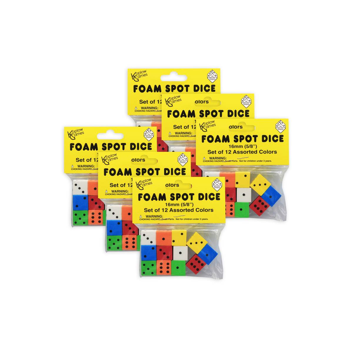 Roll out the fun with these Foam Dot Dice. Great for board games, educational games, birthday parties and plenty more. Use for your own math games to teach addition, subtraction, number recognition, multiplication and division. Dice measure 16mm (5/8"). Each pack includes 12 dice, 2 each of colors blue, green, orange, red, white and yellow. Sold as 6 sets for a total of 72 dice.