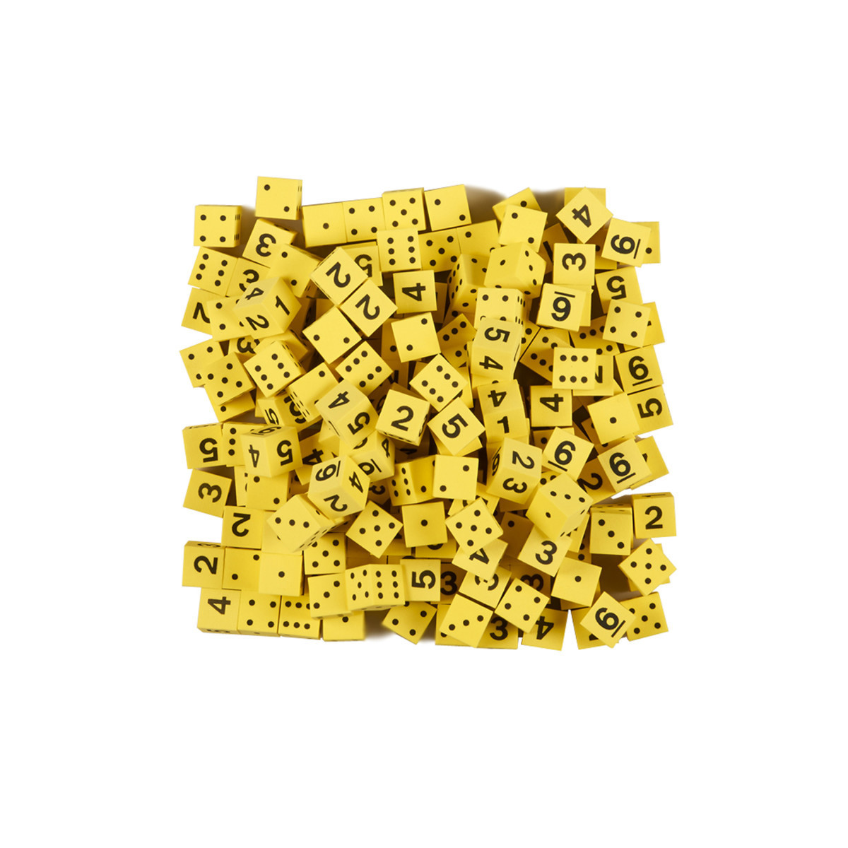 Ideal for games and practicing math skills, these soft foam dice are much quieter than regular dice. There are hundreds of counting, sorting and math applications! Includes 200 yellow, (16mm) 5/8", spot and numbers 1-6 foam dice.