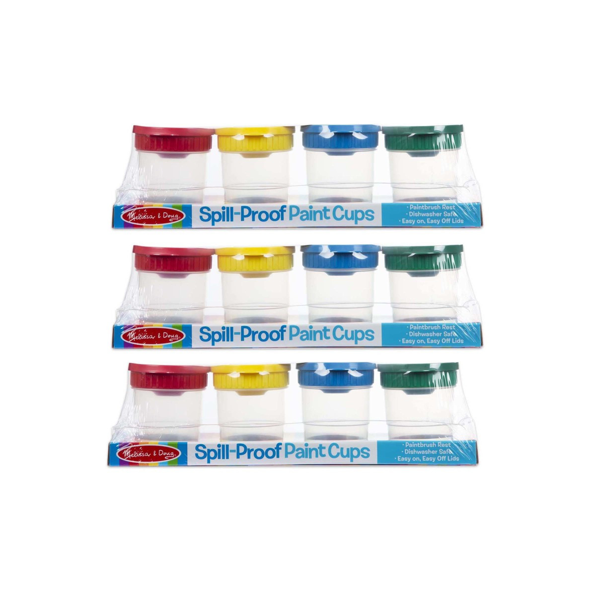 Colorful lids keep paint where it belongs! A set of 4 dishwasher-safe cups feature brush holders to keep paint from spilling and snap-on storage lids to keep paint fresh. Sold as 3 sets for a total of 12 paint cups.