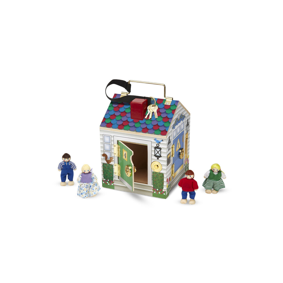 Ding Dong! Fun is at the door of this soundly-built wooden doorbell house. Four electronic doorbell sounds, four unique locks with matching keys, and four pose-able play people are included with this charming cottage! The keys are attached to the house so they won't get lost, and the sturdy handle allows this exciting house party to go wherever children go! Requires 2-AAA batteries, not included. Measures 9" x 6.8" x 6.8".