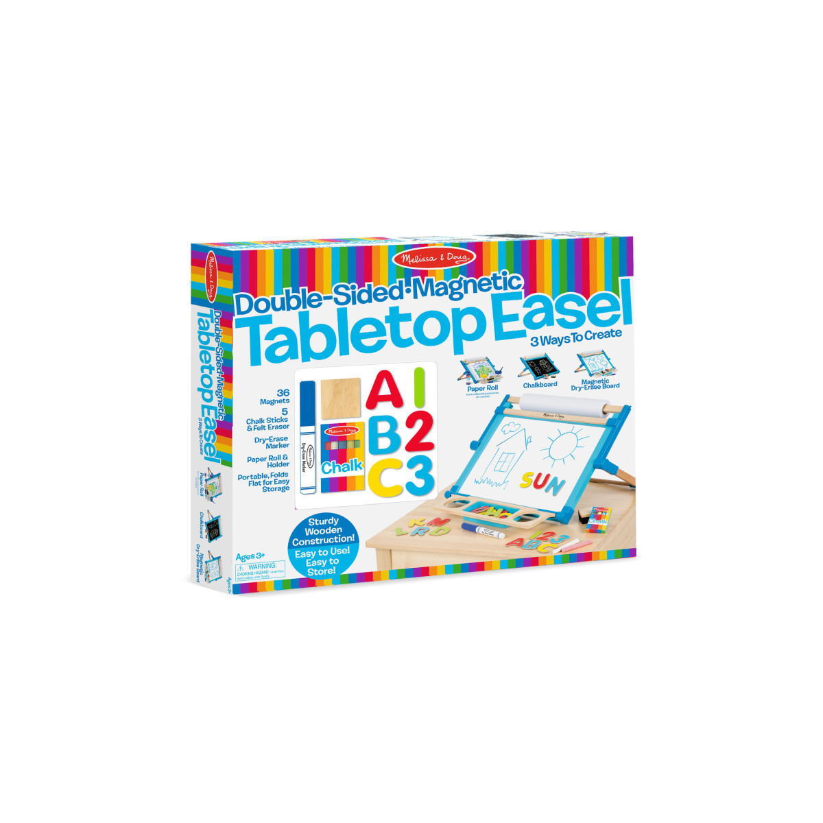 - Sturdy wooden double-sided tabletop art easel that folds flat to store