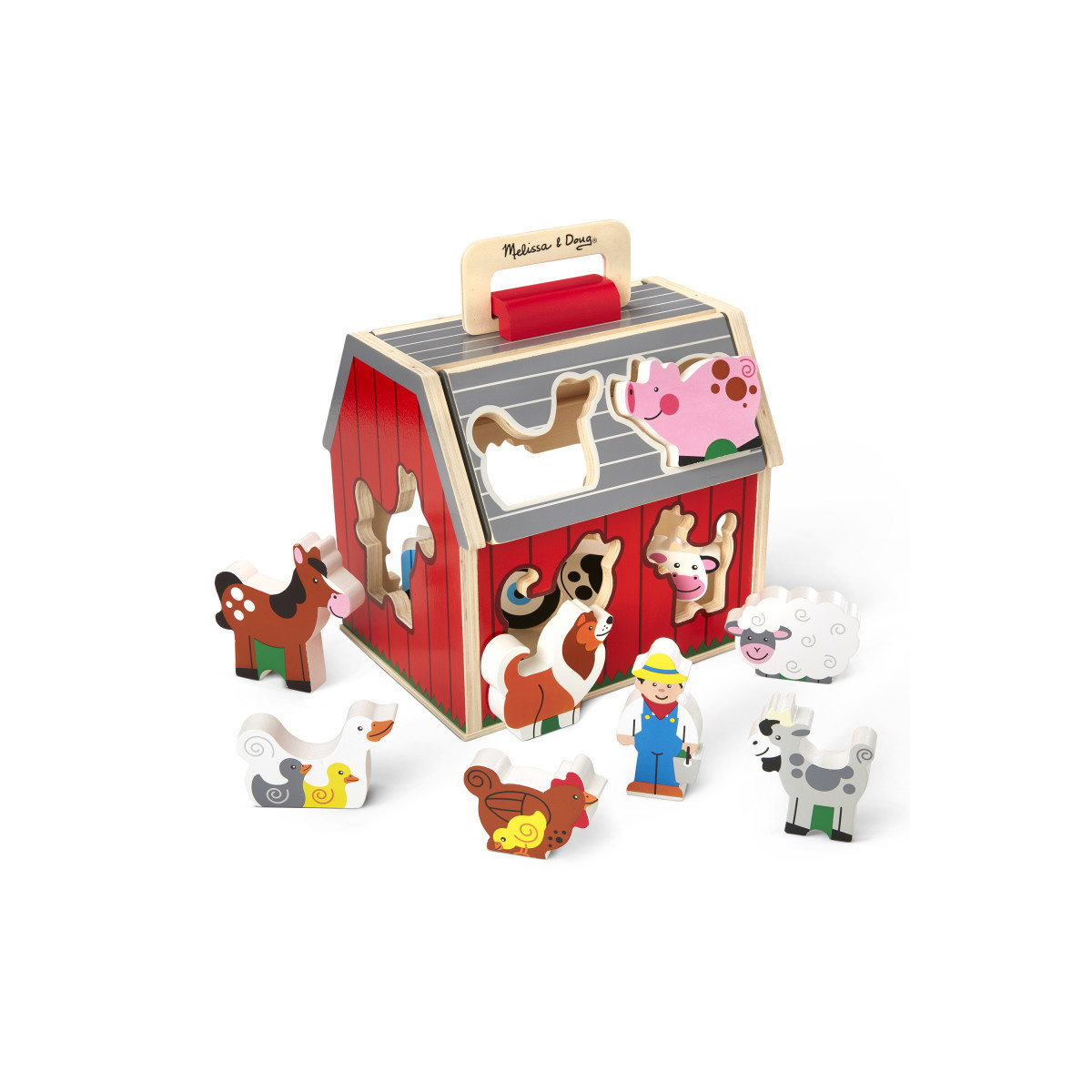 - Fit 10 wooden farm-themed play pieces into holes in the wooden sorting barn with handle for portability and flip-up roof for quick access