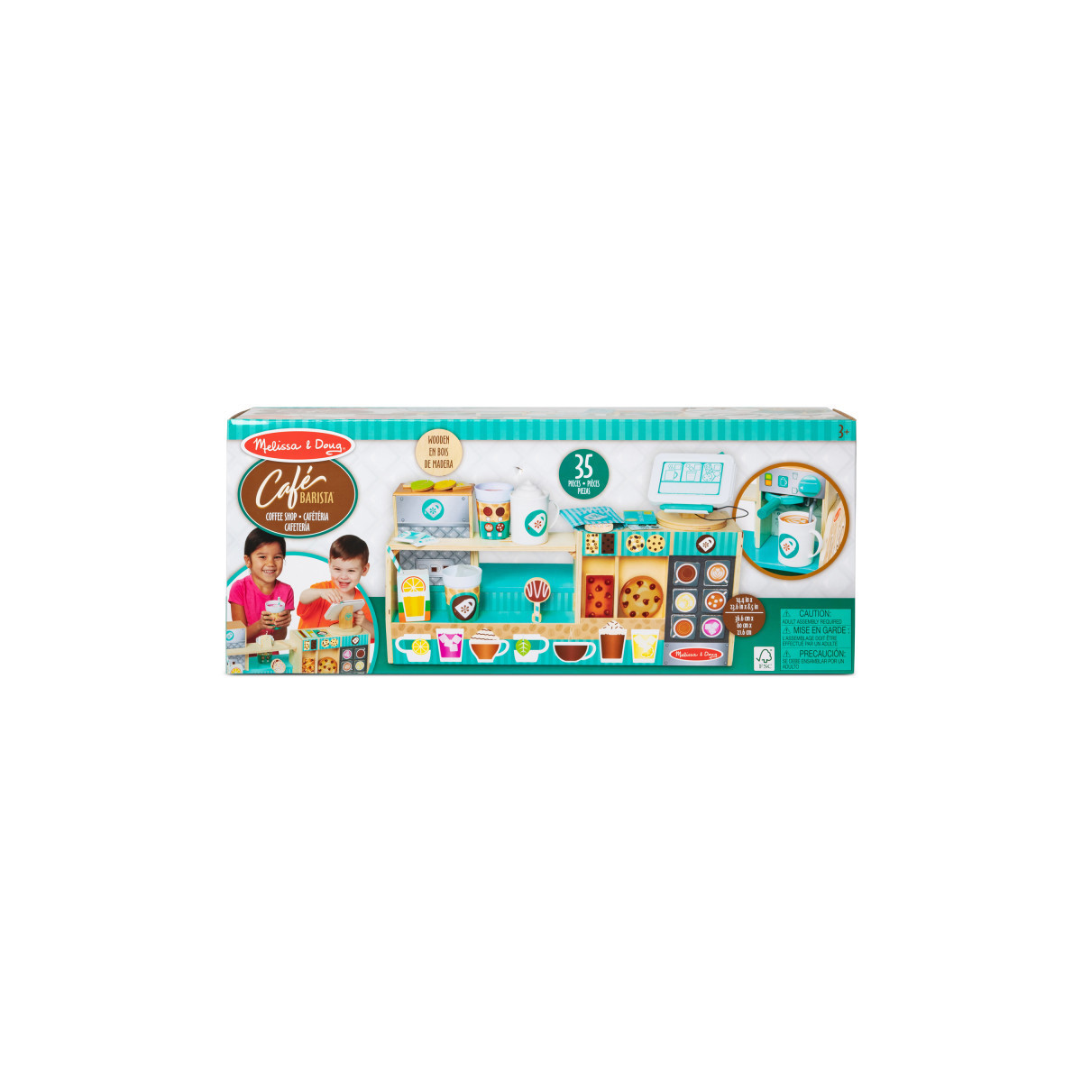 Perk up playtime with this full-service wooden coffee shop from Melissa & Doug that lets kids be the barista or the customer! Use the coffee maker with a flip filter and "steamer" and the drink dispenser with frother to prepare pretend espressos, whipped cream-topped lattes, tea, and cold drinks. Customers may choose from items listed on the magnetic menu board, including wooden double-sided cake pops, cookies, and granola bars. Then, slide the credit card in the card reader, and sign the magnetic pad to pay for purchases! This 35-piece play food set offers kids 3 to 7 countless opportunities to develop early learning skills and to create, imagine, and role play.