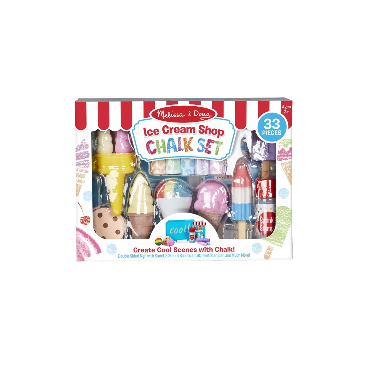 Create countless scenes with colorful chalk in "sweet" ice cream shapes! Draw, trace, and stamp chalk designs with chalk cupcakes, cookies, birthday candles, frosting, donut, jumbo sticks, and more! The vibrant colors in this deliciously adorable 33-piece play set are perfect for drawing on the included sign with holder, sidewalks, driveways, or chalkboards. Trace shapes on three extra-thick stencil sheets or make quick and easy rainbow lines with the multi-colored slice of cake! Add water to the sprinkle stamper to make chalk paint polka-dots. There's a "menu" of drawing and game ideas to help jumpstart imaginations--the possibilities are endless! Kids three and older will love creating sweet chalk designs again and again!