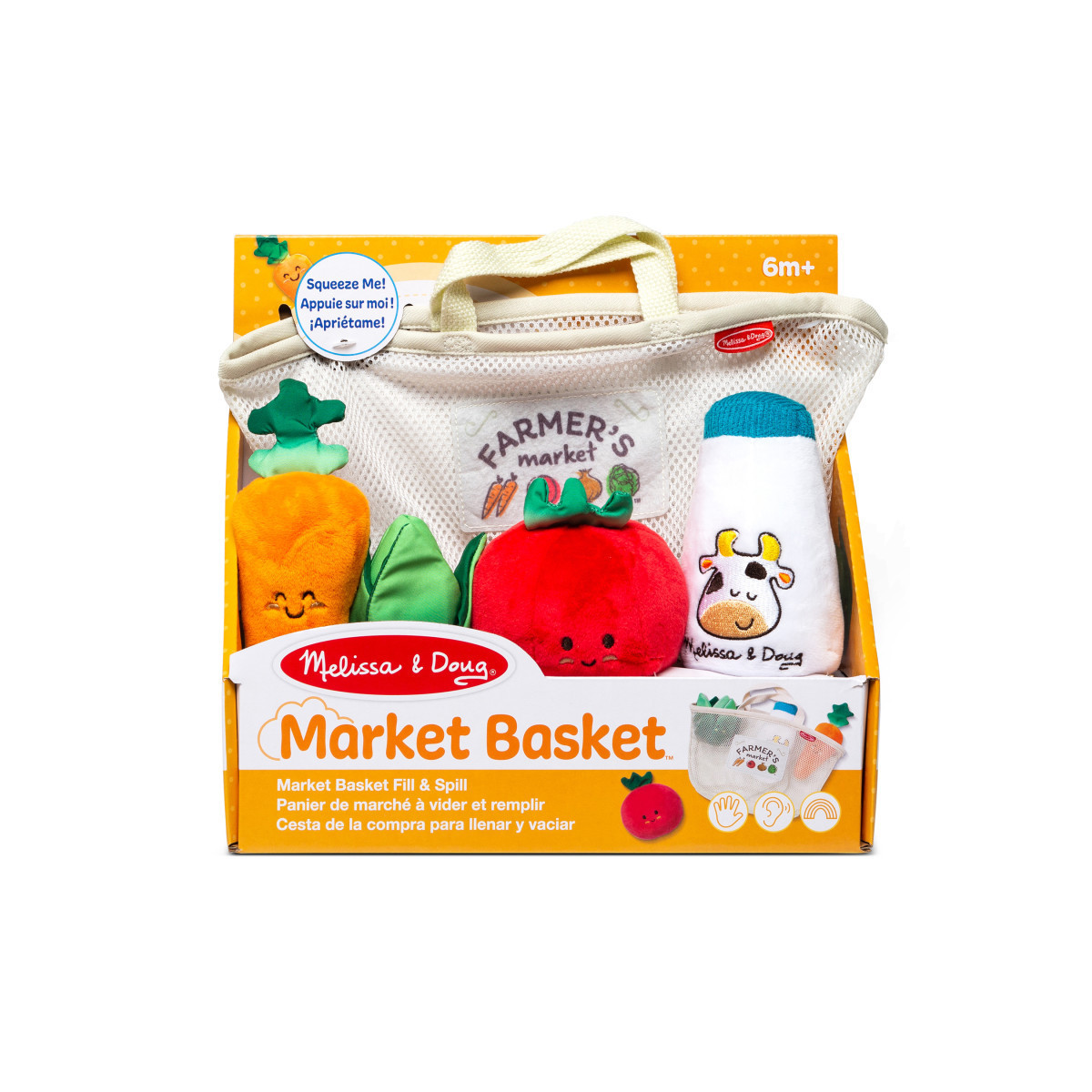 Add a fresh twist to playtime with touchable, tactile farmer's market play food favorites delight the senses! Fill the mesh mini-grocery tote with a squeaking carrot, chiming milk bottle, rattling tomato, and crinkling lettuce, all featuring sweet, friendly faces. Pull out the easy-to-grasp pieces and refill the tote again and again! The Market Basket Fill & Spill is an engaging way to help infants six months and older develop important sensory, fine motor, and color recognition skills. Melissa & Doug infant and toddler toys inspire "a-ha!" moments of discovery. Adorable, diverse characters and a variety of fun shapes and textures encourage exploratory, skill-building play.