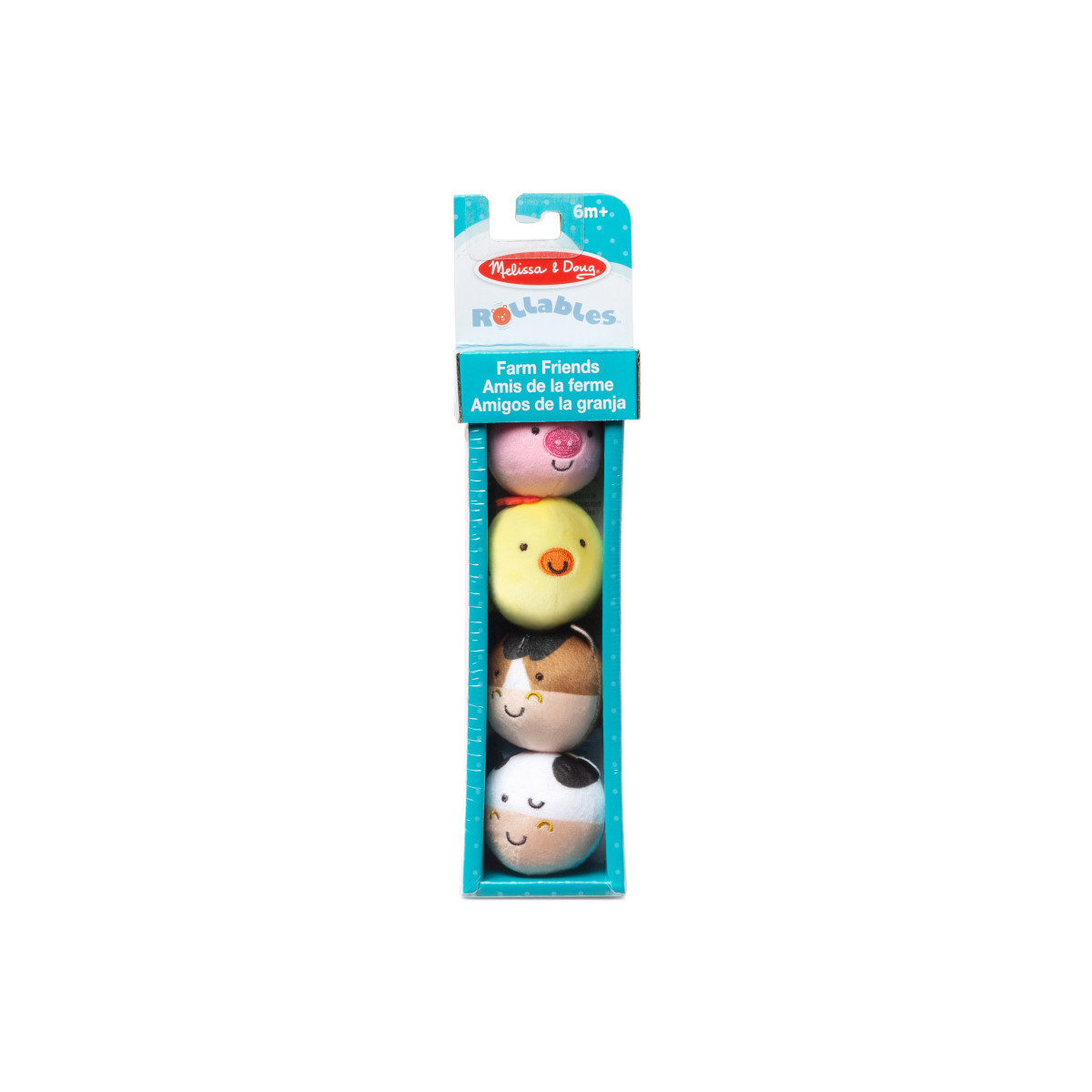 Get playtime and developmental skills rolling with Farm Friends Rollables—adorably round characters that are firm enough to roll but soft enough to squeeze! Inspire imaginative barnyard adventures through kinetic play with four farm animal Rollables that store conveniently in the package: the perky pig, cheery chicken, friendly horse, and cute cow with chime. Compatible with other Rollables play sets. Rollables are an engaging way to encourage development of important sensory and fine motor skills. Melissa & Doug infant and toddler toys inspire "a-ha!" moments of discovery. Adorable, diverse characters and a variety of fun shapes and textures encourage exploratory, skill-building play.