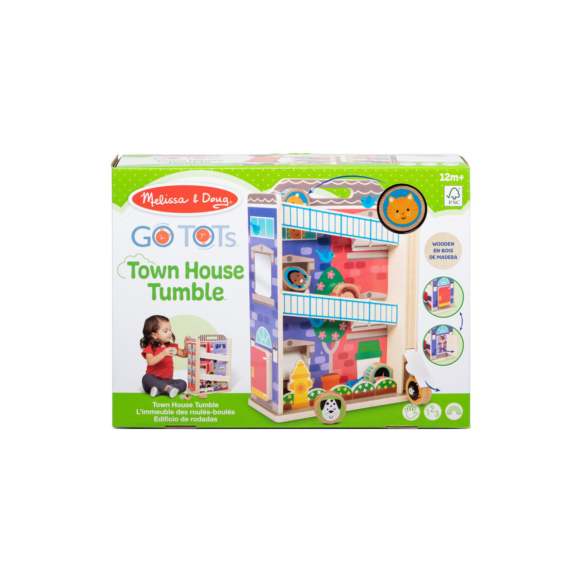- Roll, stack, and grasp 6 double-sided wooden GO Tots friends and make them tumble, twirl, and zigzag down the wooden town house tower