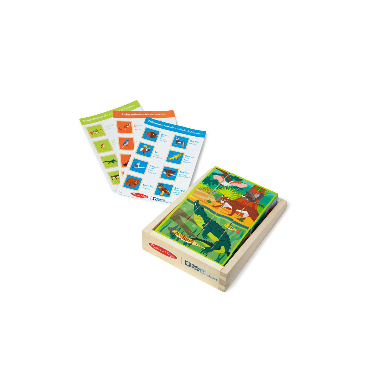 This 24-piece wooden block cube puzzle for kids two and older is a great introduction to three national parks (Everglades, Arches, and Yellowstone) and the animals that live in each! Use the sturdy wooden blocks to piece together a scene from each of the three parks. Blocks also have the full alphabet plus extras of some letters so kids can spell out the names of the animals shown on other sides of the blocks and on the included identification guides. Guides include the animal names in English and Spanish, pictures of the completed park scenes, and search-and-find activities. This a great learning toy for matching and problem-solving, as well as terrific for fine motor skill development! The puzzle blocks store in a sturdy wooden tray, which can also be used for display. Melissa & Doug® is proud to support the National Park Foundation with a million-dollar minimum donation over three years. The Melissa & Doug® National Park Foundation collection is designed to inspire kids to discover the wonder of America's national parks. Together, we're helping protect our parks for present and future generations!