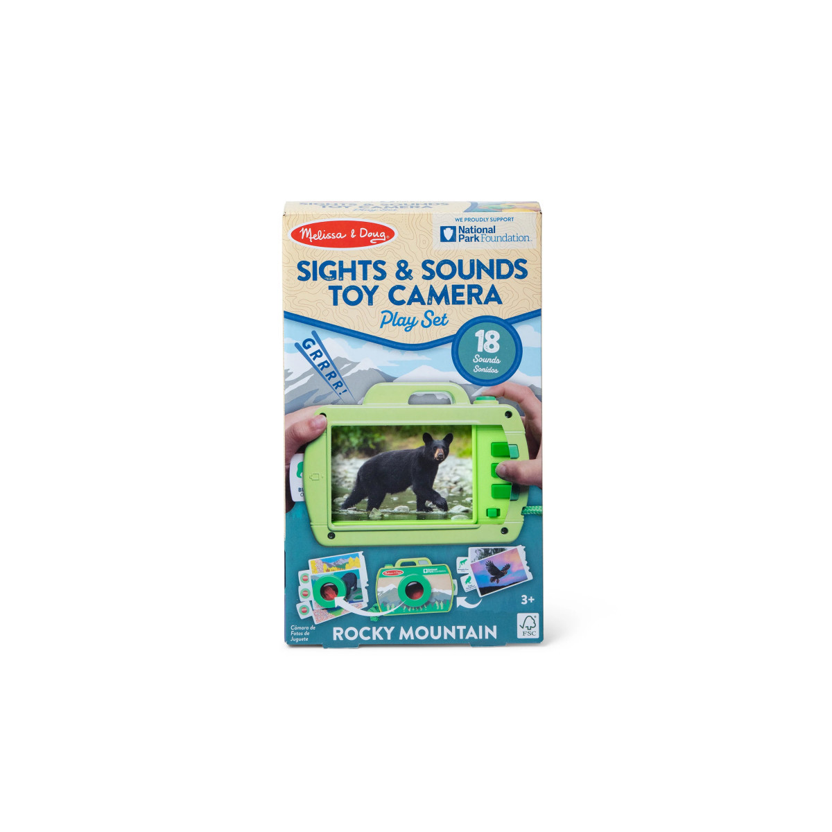Take an exciting imaginative journey through Rocky Mountain National Park and discover the animals that live there and the sounds they make! Slide a photo card into the wooden play camera, and click the shutter button to activate the flash. Press the buttons on the back to hear three nature and animal sounds per card (sounds are unique to each of the six photos)! The removable red lens magnifier lets kids three and older search for plants and animals hidden in scenes on the backs of the photo cards. Kids will learn as they play -- the reusable activity card includes native animal and plant identification and fun facts in English and Spanish, plus a park map on the back for pretend play adventures. Everything stores in a handy camera bag. Melissa & Doug® is proud to support the National Park Foundation with a million-dollar minimum donation over three years. The Melissa & Doug® National Park Foundation collection is designed to inspire kids to discover the wonder of America's national parks. Together, we're helping protect our parks for present and future generations