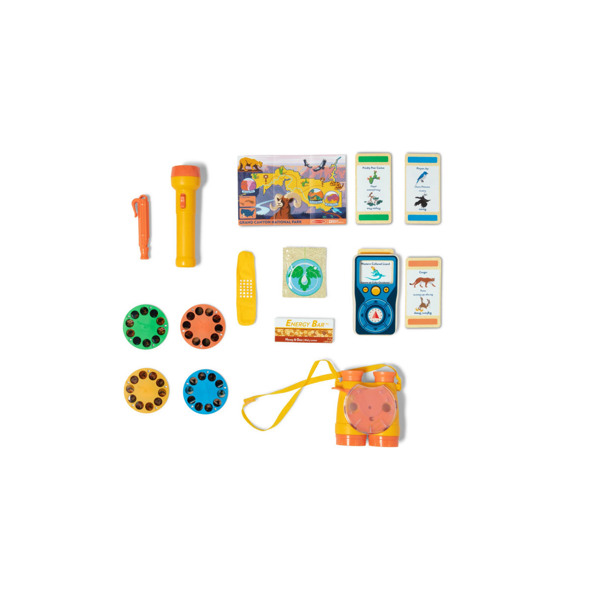 Take an imagination-filled hike through Grand Canyon National Park! Play hiking essentials (including a working flashlight for night hikes) store on a sturdy, adjustable belt, sized to fit kids three to six. Rotate four photo disks in the play binoculars to see canyon scenes and native animals and plants—five beautiful color photos per disk bring the park to life right before kids' eyes! Slide ID cards into the wooden play "tracker" to identify in English and Spanish the native plants and animals you see! The gear belt holds everything, including a double-sided map and field guide, play first aid supplies, a wooden energy bar, and safety whistle. 2 AA batteries required for the flashlight (not included). Melissa & Doug® is proud to support the National Park Foundation with a million-dollar minimum donation over three years. The Melissa & Doug® National Park Foundation collection is designed to inspire kids to discover the wonder of America's national parks. Together, we're helping protect our parks for present and future generations!
