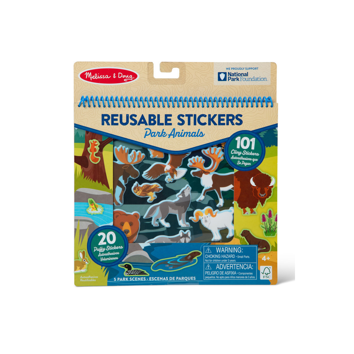Take a creative storytelling journey through five national parks (Denali, Everglades, Biscayne, Yellowstone, Grand Canyon) and learn the names of the animals and plants there! Tell imaginative stories by matching 20 Denali-themed puffy stickers and 101 cling-style stickers to illustrated glossy park scenes, then peel the stickers off to rearrange again and again! Large, top spiral-bound pad lets scenes lay flat, and makes the set great for travel. Stickers store on color-coded tabbed pages inside for mess-free play! Not just fun, this educational set is also a great learning toy: Identification pages in English and Spanish help kids learn the names of plants and animals native to each of the five national parks. Melissa & Doug® is proud to support the National Park Foundation with a million-dollar minimum donation over three years. The Melissa & Doug® National Park Foundation collection is designed to inspire kids to discover the wonder of America's national parks. Together, we're helping protect our parks for present and future generations!