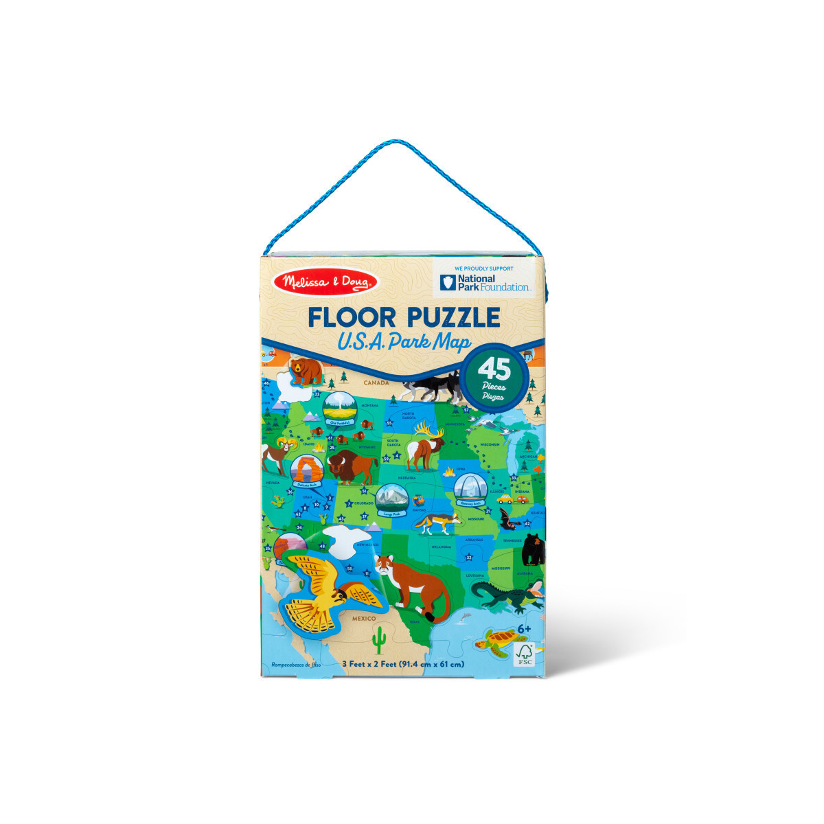 Take an imaginative journey across the U.S.A. and learn about 63 national parks through puzzle play! Piece together the 45-piece jumbo cardboard jigsaw puzzle, featuring special animal-shaped pieces, search-and-find activities, and animal track identification along the border. Designed to make learning fun, states and points of interest are labeled, and a key inside includes an animal ID guide, park identification, and the search-and-find answers in English and Spanish! Completed puzzle is approximately 3 feet by 2 feet (91.4 cm x 61 cm). Puzzle play encourages fine motor and problem-solving skills and promotes concentration, memory, and independent learning. Melissa & Doug® is proud to support the National Park Foundation with a million-dollar minimum donation over three years. The Melissa & Doug® National Park Foundation collection is designed to inspire kids to discover the wonder of America's national parks. Together, we're helping protect our parks for present and future generations!