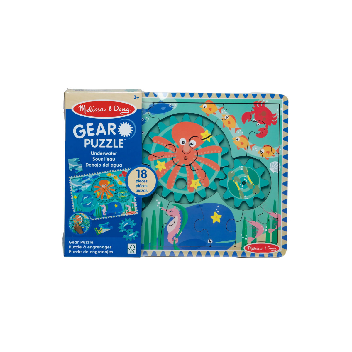 Piece together 18 wooden pieces to create a colorful underwater scene and a puzzle that moves! With this innovative and unique puzzle, pieces fit over pegs in the wooden puzzle board to create three interlocking gears that spin when the puzzle is complete. Artwork depicting an engaging ocean scene is on the puzzle board for easy matching. Vibrant colors and a variety of sea creatures encourage counting and color recognition, and the gears are great for fine motor development and for teaching cause and effect. Puzzle play helps to promote logical thinking, goal setting, and patience. The Melissa & Doug Wooden Underwater Gear Puzzle is an engaging, hands-on, screen-free activity for kids three and older.