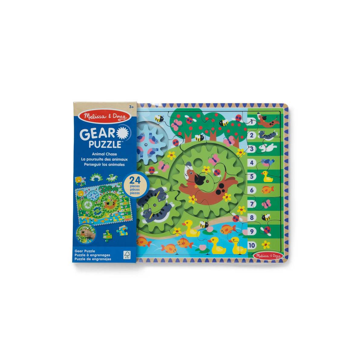 - Piece together an animal-themed 24-piece wooden jigsaw puzzle with 4 interlocking gears that spin