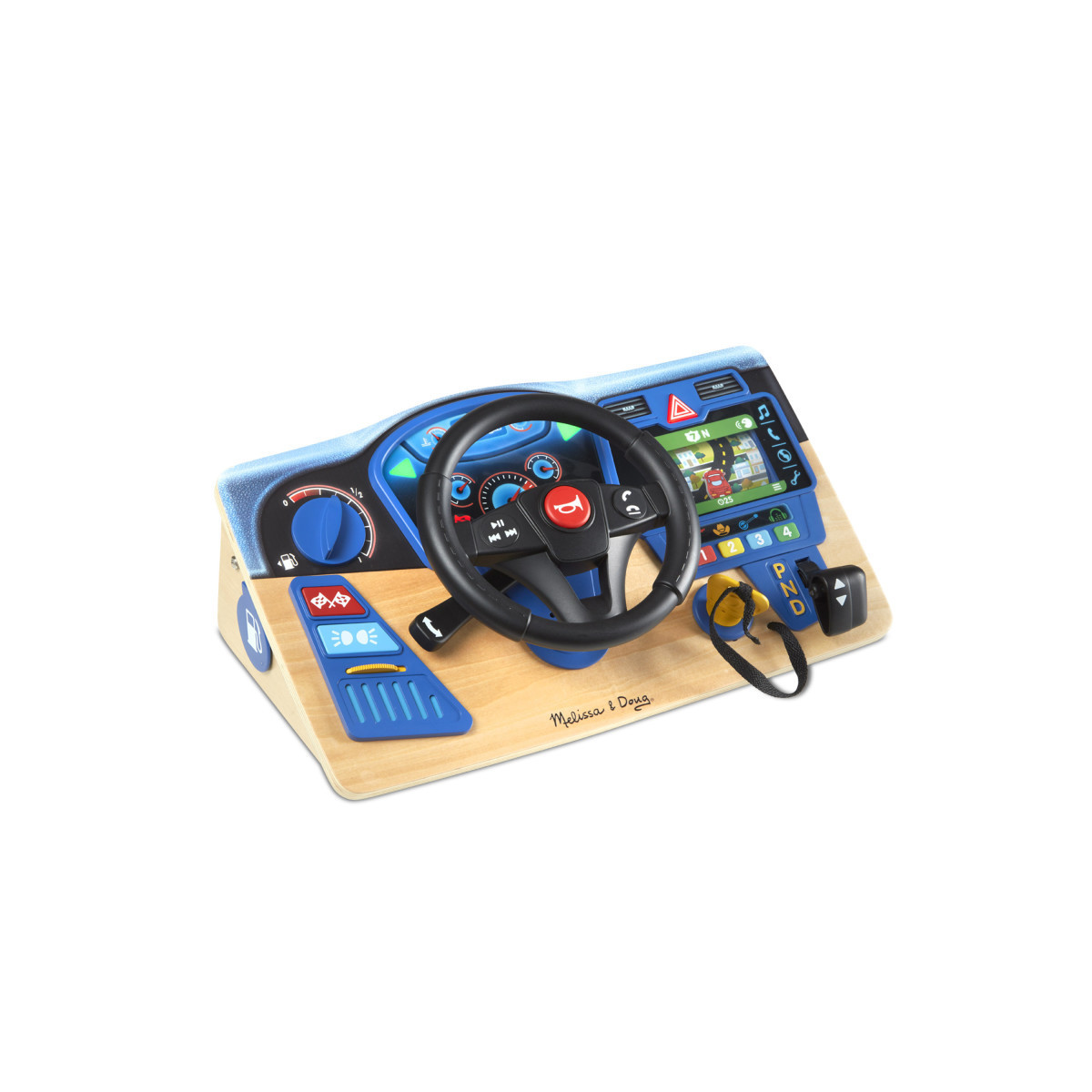 Rev up playtime and take imaginations for a spin with this realistic play steering wheel mounted on a sturdy wooden dashboard with lights, sound effects, and moving parts, including a scrolling GPS! Turn the key to start and shift into drive to get the GPS rolling - turn the wheel to keep the car on the road on the GPS display! The interactive dashboard includes hands-free buttons on the steering wheel for a phone and the radio, which plays clips of music for each of four stations. Movable parts and buttons let kids three and older beep the horn, adjust air vents, turn on signal, hazard, and headlight indicators, and rev the engine. Set a timer to count down to empty gas tank, and remove the gas cap when its time to fill up! A terrific toy for hand-eye coordination, imaginative play, and to help teach cause and effect.