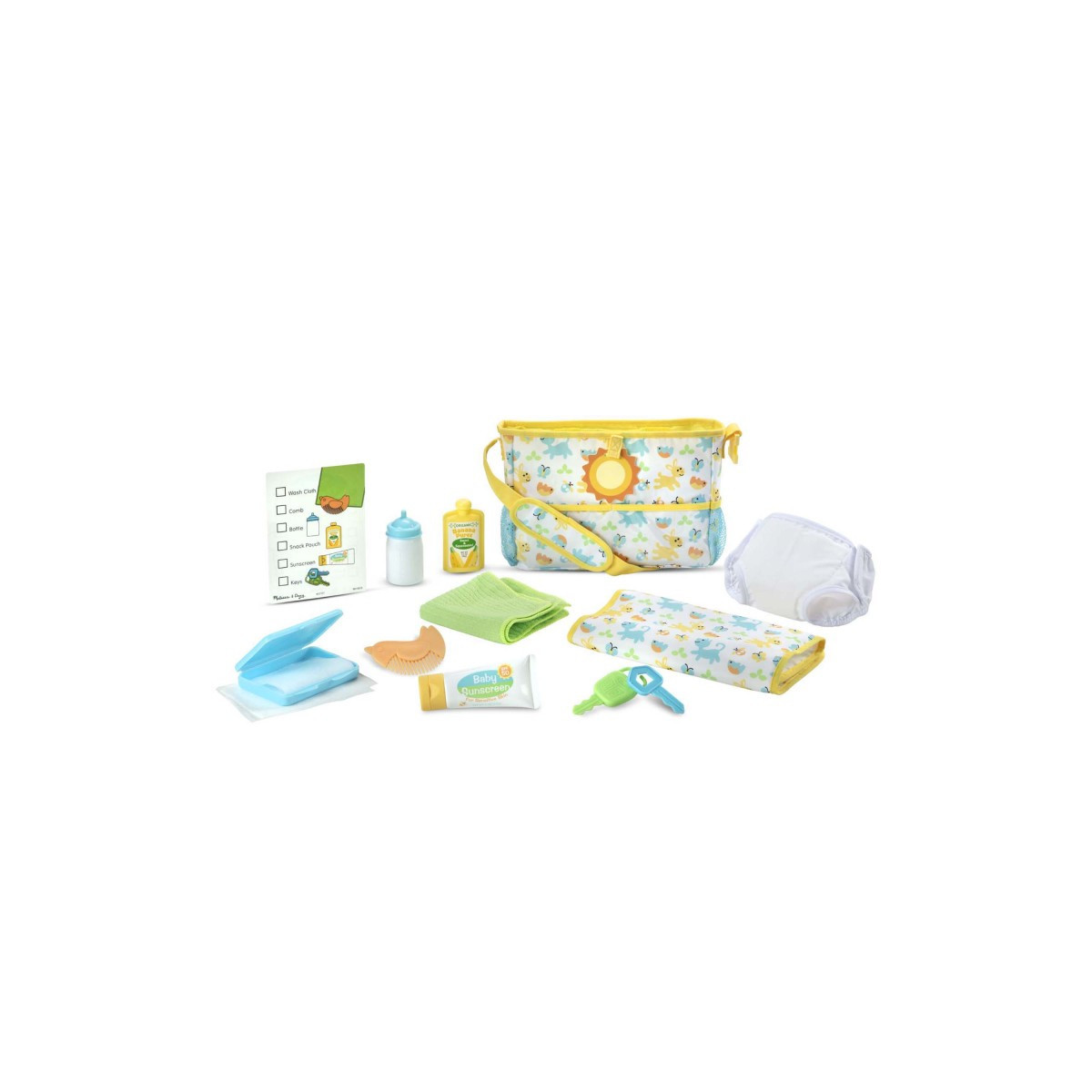 - Includes diaper (fits dolls up to 18 inches), changing mat, 4 wipes in snap-shut container, washcloth, comb, sunscreen tube, baby bottle, squeeze snack pouch, two keys double-sided reusable activity card