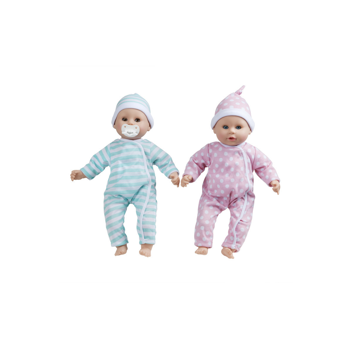 - Two 15-inch clothed boy and girl baby dolls with light skin tone that can suck their thumbs or pacifiers