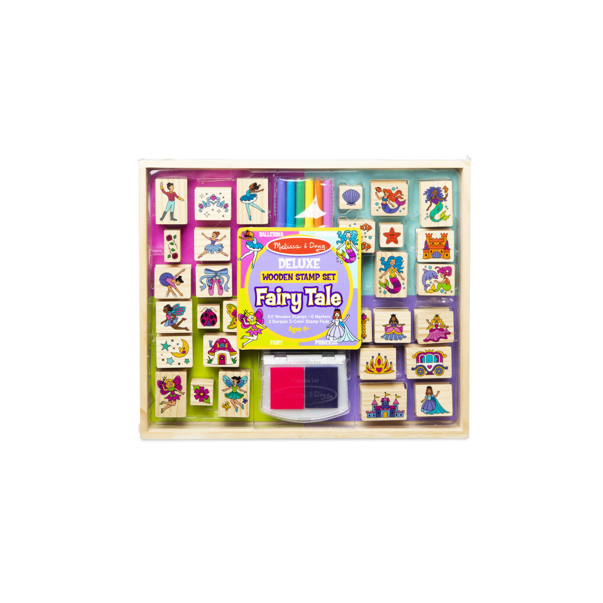 - Includes 30 magical wooden-handled rubber fairy tale stamps (ballet, mermaid, fairy, and princess), 2 2-color washable ink pads (pink, purple, blue, green), 6 colorful markers