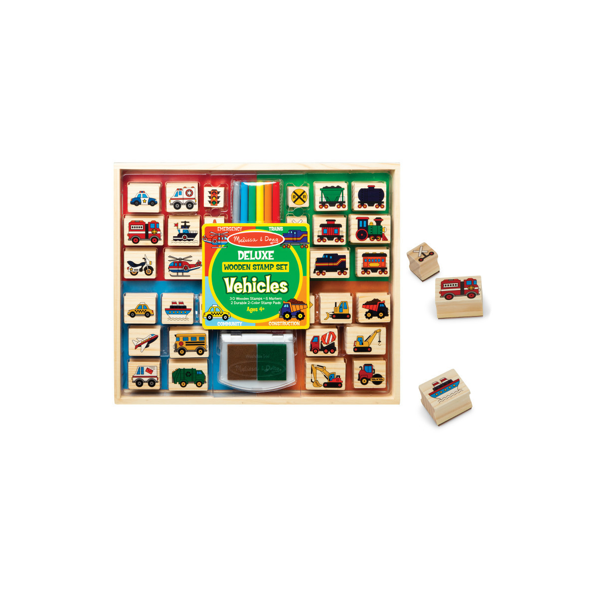 - Includes 30 exciting wooden-handled rubber vehicle stamps (emergency, trains, construction, community), 2 2-color washable ink pads (brown, green, blue, red), 6 colorful markers