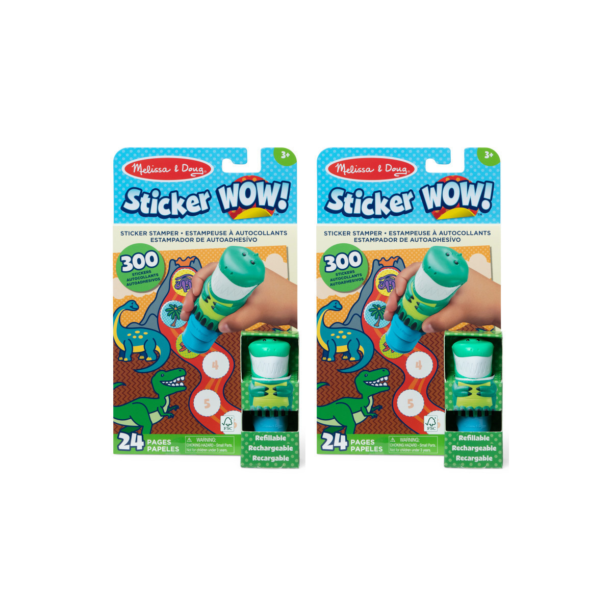 Melissa & Doug Sticker WOW!™ is a whole new way to play with stickers! Let the adorable, collectible Olive the Dinosaur stamp, stamp, stamp its way through 24 pages of fun-filled, prehistoric-themed counting, matching, and search-and-find activities. The refillable sticker stamper comes pre-loaded with a sticker stack of 300 assorted stickers – with 100 unique designs in every stack, each sticker is a surprise! Themed refill packs are sold separately and are compatible with any Sticker WOW!™ sticker stamper. Stickers are not reusable, but are easy to remove if necessary. Fill in the activity pages and use for creative art projects, such as bookmarks, posters, cards, and more. Easy-to-remove stickers and the convenient on-the-go format with built-in sticker stamper storage makes Sticker WOW!™ (patent pending) a great mess-free travel activity. Sticker WOW!™ promotes fine motor skills, encourages creative play, and it's satisfying, fidget fun! Sold as a pack of 2 complete activity pad sets.